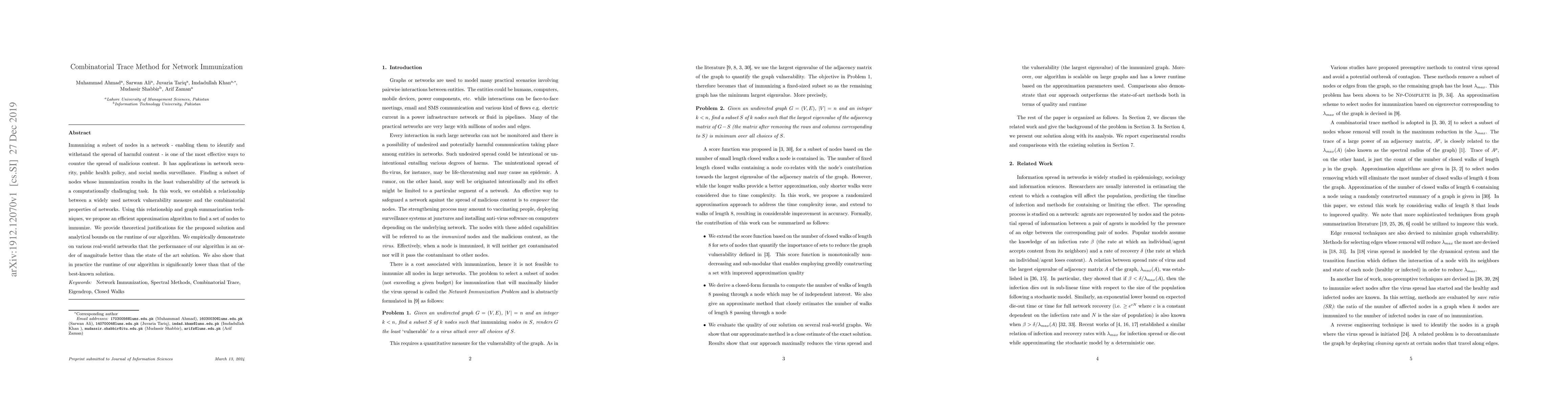 Immunizing a subset of nodes in a network - enabling them to identify and withstand the spread of harmful content - is one of the most effective ways to counter the spread of malicious content. It has applications in network security, public health policy, and social media surveillance. Finding a subset of nodes whose immunization results in the least vulnerability of the network is a computationally challenging task. In this work, we establish a relationship between a widely used network vulnerability measure and the combinatorial properties of networks. Using this relationship and graph summarization techniques, we propose an efficient approximation algorithm to find a set of nodes to immunize. We provide theoretical justifications for the proposed solution and analytical bounds on the runtime of our algorithm. We empirically demonstrate on various real-world networks that the performance of our algorithm is an order of magnitude better than the state of the art solution. We also show that in practice the runtime of our algorithm is significantly lower than that of the best-known solution.