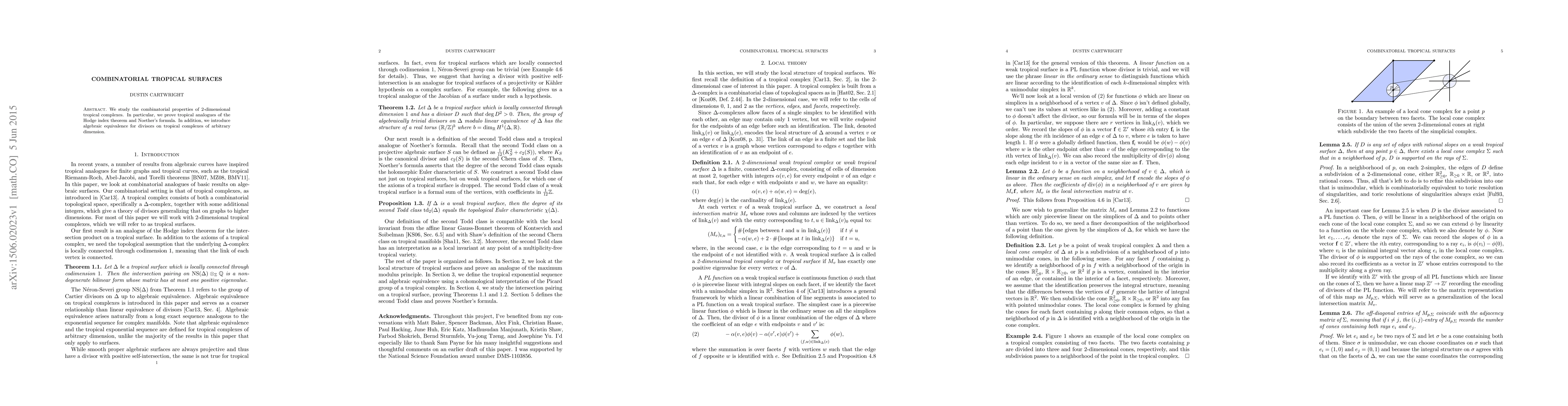 This paper explores the combinatorial characteristics of 2-dimensional tropical complexes, proving tropical analogues of the Hodge index theorem and Noether's formula, and introducing algebraic equivalence for divisors on tropical complexes of any dimension.