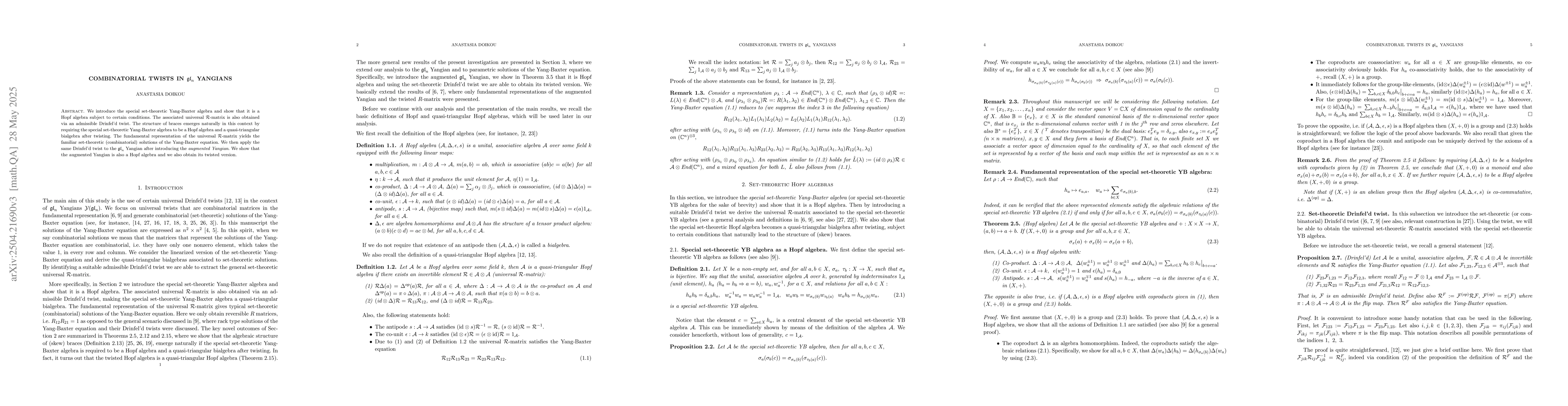 We introduce the special set-theoretic Yang-Baxter algebra and show that it is a Hopf algebra. The associated universal R-matrix is also obtained via an admissible Drinfel'd twist, making the algebra a quasi-triangular Hopf algebra. The fundamental representation of the universal R-matrix yields the familiar set-theoretic (combinatorial) solutions of the Yang-Baxter equation. We then apply the same Drinfel'd twist to the gl_n Yangian after introducing the augmented Yangian. We show that the augmented Yangian is also a Hopf algebra and we obtain the twisted version of the augmented gl_n Yangian as well as the twisted R-matrix.