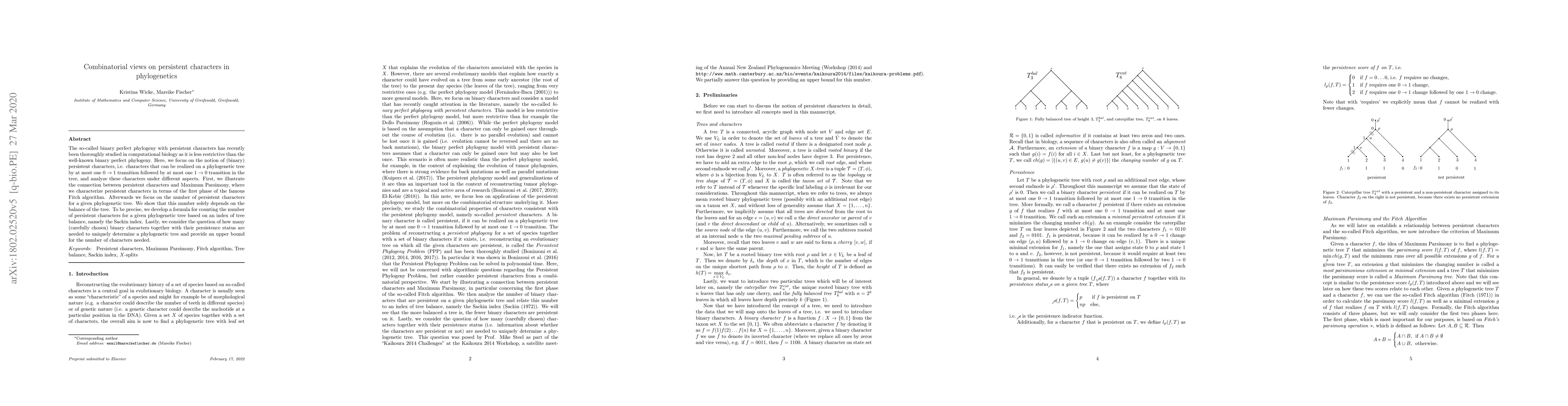 The so-called binary perfect phylogeny with persistent characters has recently been thoroughly studied in computational biology as it is less restrictive than the well known binary perfect phylogeny. Here, we focus on the notion of (binary) persistent characters, i.e. characters that can be realized on a phylogenetic tree by at most one $0 \rightarrow 1$ transition followed by at most one $1 \rightarrow 0$ transition in the tree, and analyze these characters under different aspects. First, we illustrate the connection between persistent characters and Maximum Parsimony, where we characterize persistent characters in terms of the first phase of the famous Fitch algorithm. Afterwards we focus on the number of persistent characters for a given phylogenetic tree. We show that this number solely depends on the balance of the tree. To be precise, we develop a formula for counting the number of persistent characters for a given phylogenetic tree based on an index of tree balance, namely the Sackin index. Lastly, we consider the question of how many (carefully chosen) binary characters together with their persistence status are needed to uniquely determine a phylogenetic tree and provide an upper bound for the number of characters needed.