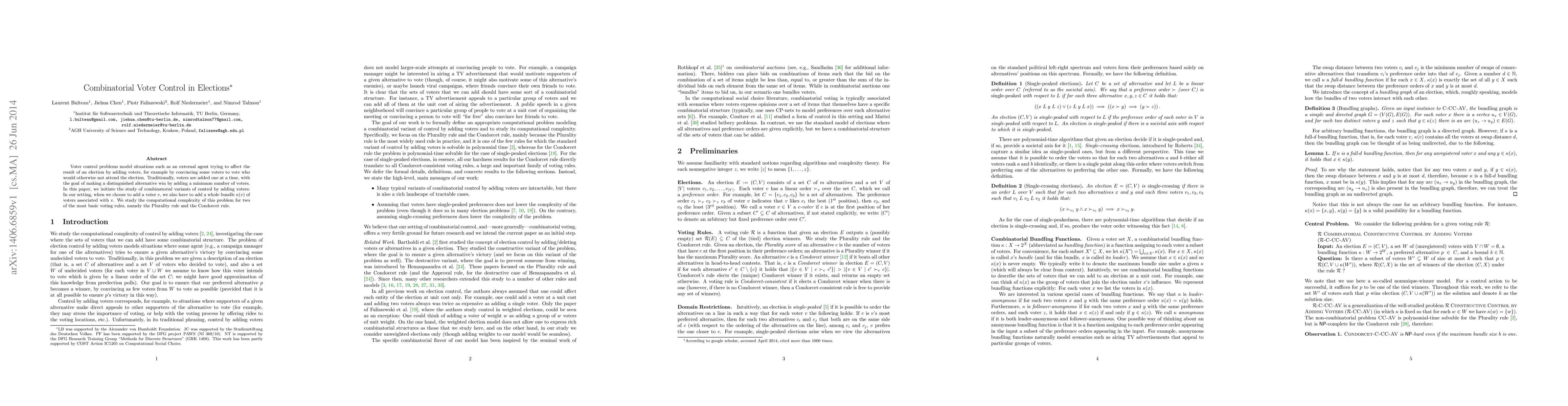 This paper explores combinatorial voter control in elections, where voters are added in bundles, and examines the computational complexity of influencing election outcomes under the Plurality and Condorcet rules. The study focuses on the minimum number of voter bundles needed to sway the election result.