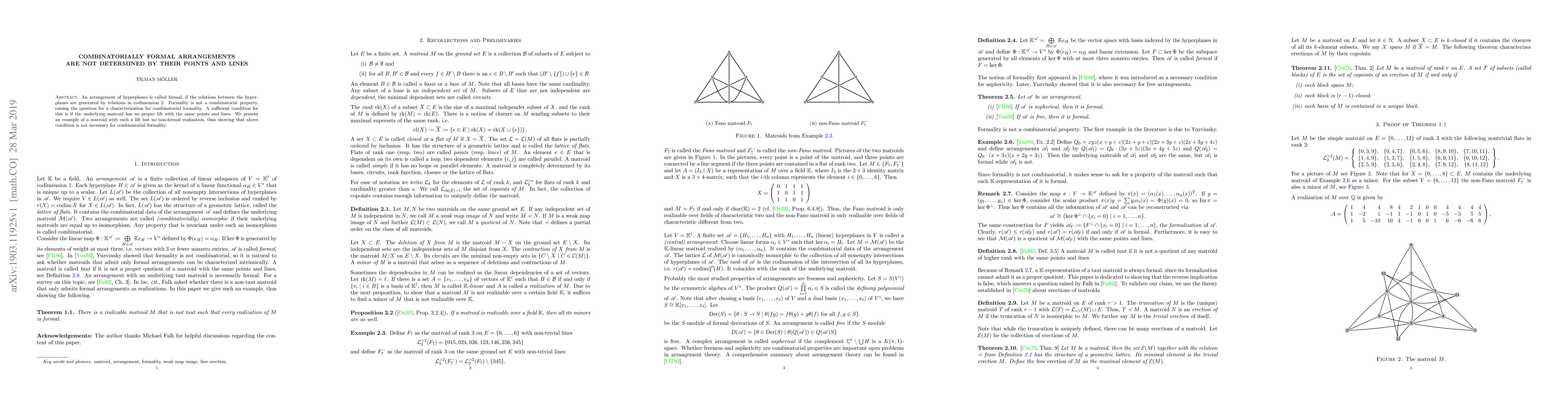 An arrangement of hyperplanes is called formal, if the relations between the hyperplanes are generated by relations in codimension 2. Formality is not a combinatorial property, raising the question for a characterization for combinatorial formality. A sufficient condition for this is if the underlying matroid has no proper lift with the same points and lines. We present an example of a matroid with such a lift but no non-formal realization, thus showing that above condition is not necessary for combinatorial formality.