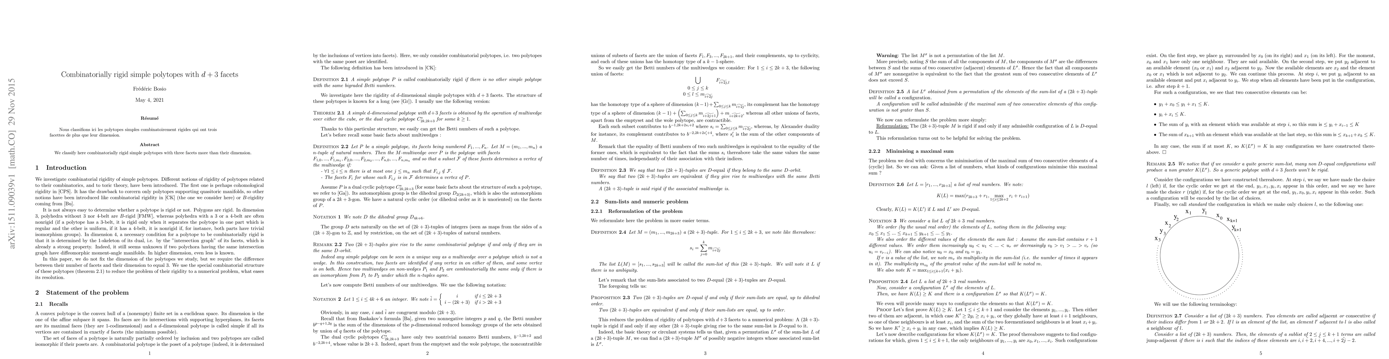 This paper classifies combinatorially rigid simple polytopes that have three more facets than their dimension. The study focuses on the structural properties that ensure such polytopes maintain their combinatorial structure under various transformations.