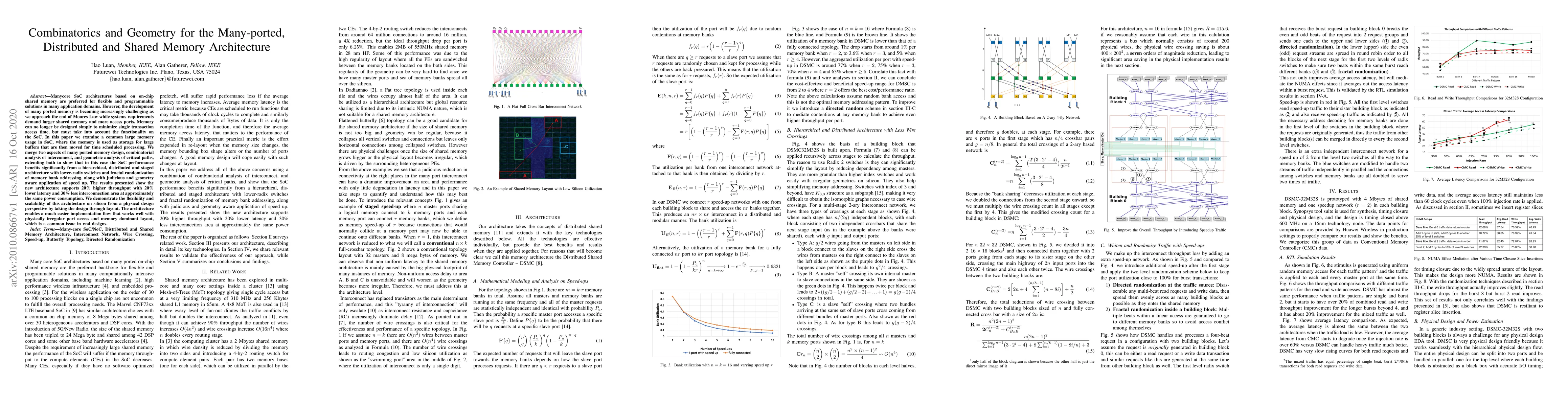 Manycore SoC architectures based on on-chip shared memory are preferred for flexible and programmable solutions in many application domains. However, the development of many ported memory is becoming increasingly challenging as we approach the end of Moore's Law while systems requirements demand larger shared memory and more access ports. Memory can no longer be designed simply to minimize single transaction access time, but must take into account the functionality on the SoC. In this paper we examine a common large memory usage in SoC, where the memory is used as storage for large buffers that are then moved for time scheduled processing. We merge two aspects of many ported memory design, combinatorial analysis of interconnect, and geometric analysis of critical paths, extending both to show that in this case the SoC performance benefits significantly from a hierarchical, distributed and staged architecture with lower-radix switches and fractal randomization of memory bank addressing, along with judicious and geometry aware application of speed up. The results presented show the new architecture supports 20% higher throughput with 20% lower latency and 30% less interconnection area at approximately the same power consumption. We demonstrate the flexibility and scalability of this architecture on silicon from a physical design perspective by taking the design through layout. The architecture enables a much easier implementation flow that works well with physically irregular port access and memory dominant layout, which is a common issue in real designs.