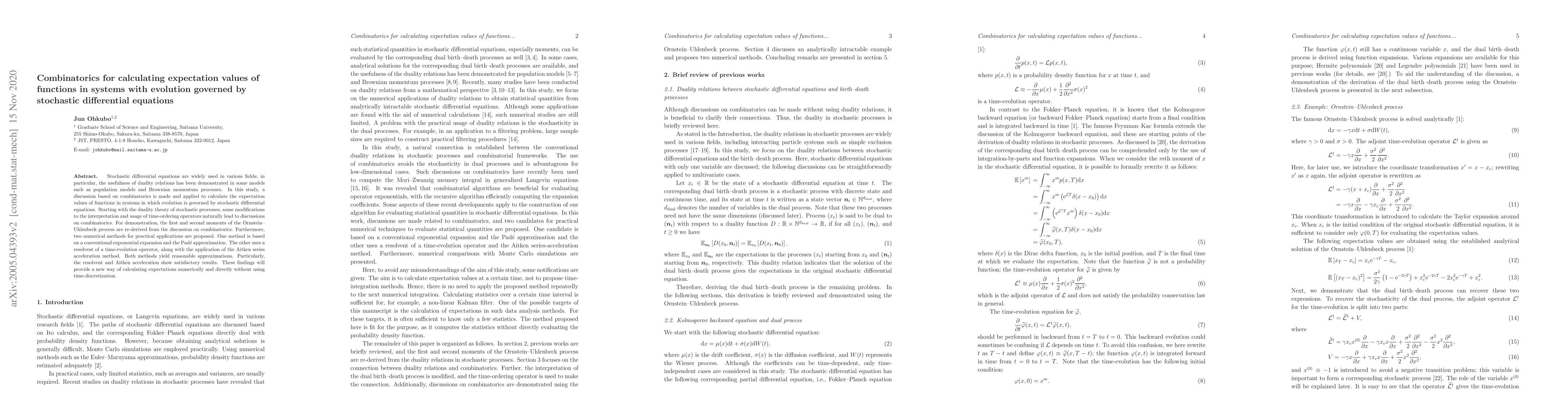Stochastic differential equations are widely used in various fields; in particular, the usefulness of duality relations has been demonstrated in some models such as population models and Brownian momentum processes. In this study, a discussion based on combinatorics is made and applied to calculate the expectation values of functions in systems in which evolution is governed by stochastic differential equations. Starting with the duality theory of stochastic processes, some modifications to the interpretation and usage of time-ordering operators naturally lead to discussions on combinatorics. For demonstration, the first and second moments of the Ornstein-Uhlenbeck process are re-derived from the discussion on combinatorics. Furthermore, two numerical methods for practical applications are proposed. One method is based on a conventional exponential expansion and the Pade approximation. The other uses a resolvent of a time-evolution operator, along with the application of the Aitken series acceleration method. Both methods yield reasonable approximations. Particularly, the resolvent and Aitken acceleration show satisfactory results. These findings will provide a new way of calculating expectations numerically and directly without using time-discretization.