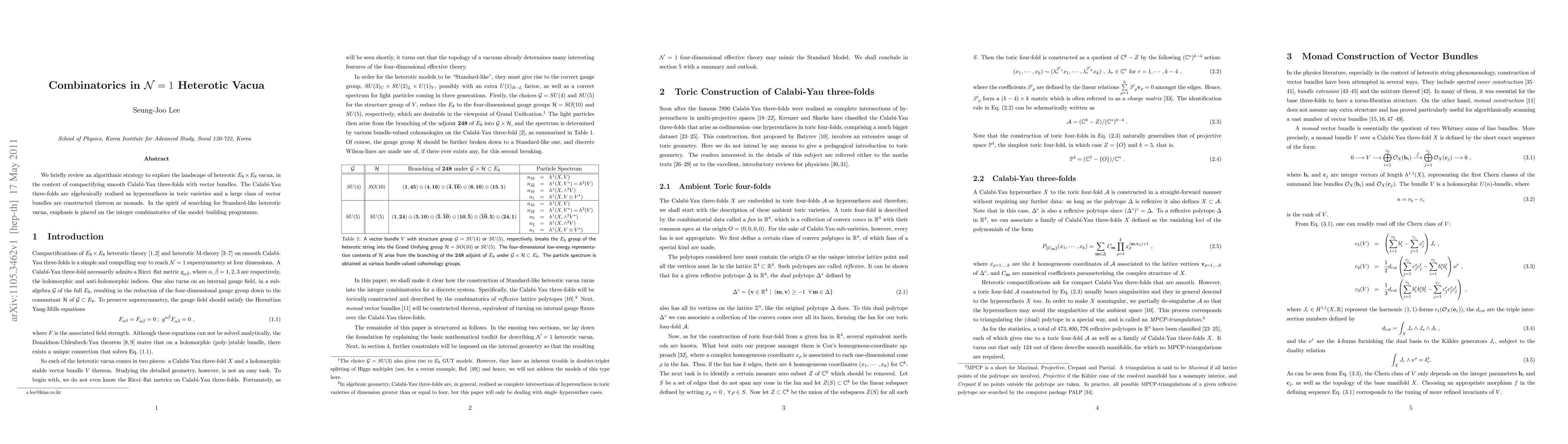 This paper explores an algorithmic approach to investigate the vast landscape of N=1 heterotic E8 × E8 vacua by compactifying on smooth Calabi-Yau three-folds realized as hypersurfaces in toric varieties, focusing on the combinatorial construction of vector bundles via monads. The study emphasizes the integer combinatorics essential for building Standard-like heterotic vacua.