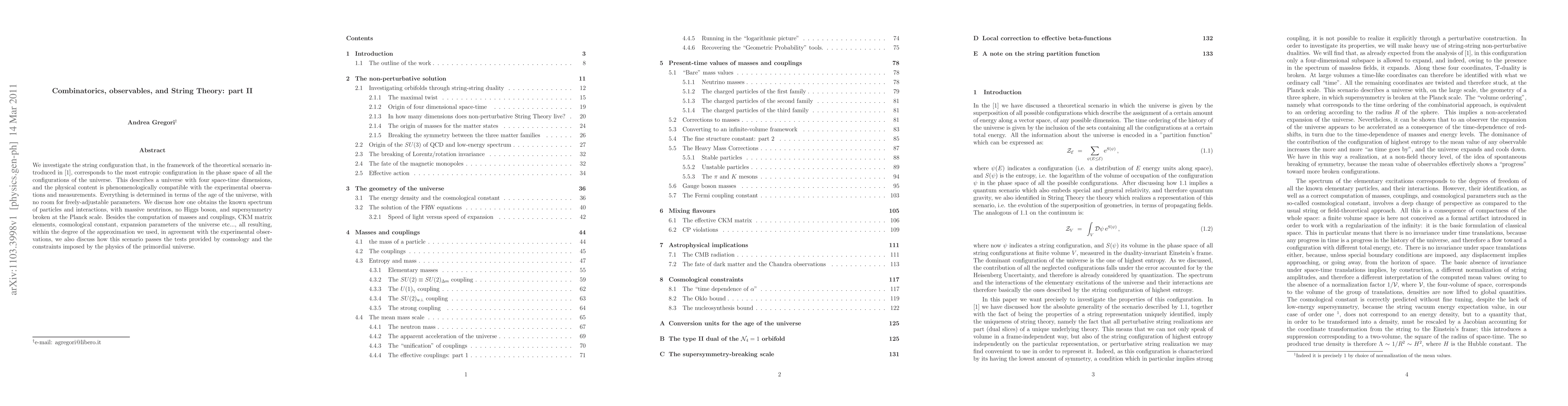 We investigate the string configuration that, in the framework of the theoretical scenario introduced in [1], corresponds to the most entropic configuration in the phase space of all the configurations of the universe. This describes a universe with four space-time dimensions, and the physical content is phenomenologically compatible with the experimental observations and measurements. Everything is determined in terms of the age of the universe, with no room for freely-adjustable parameters. We discuss how one obtains the known spectrum of particles and interactions, with massive neutrinos, no Higgs boson, and supersymmetry broken at the Planck scale. Besides the computation of masses and couplings, CKM matrix elements, cosmological constant, expansion parameters of the universe etc..., all resulting, within the degree of the approximation we used, in agreement with the experimental observations, we also discuss how this scenario passes the tests provided by cosmology and the constraints imposed by the physics of the primordial universe.