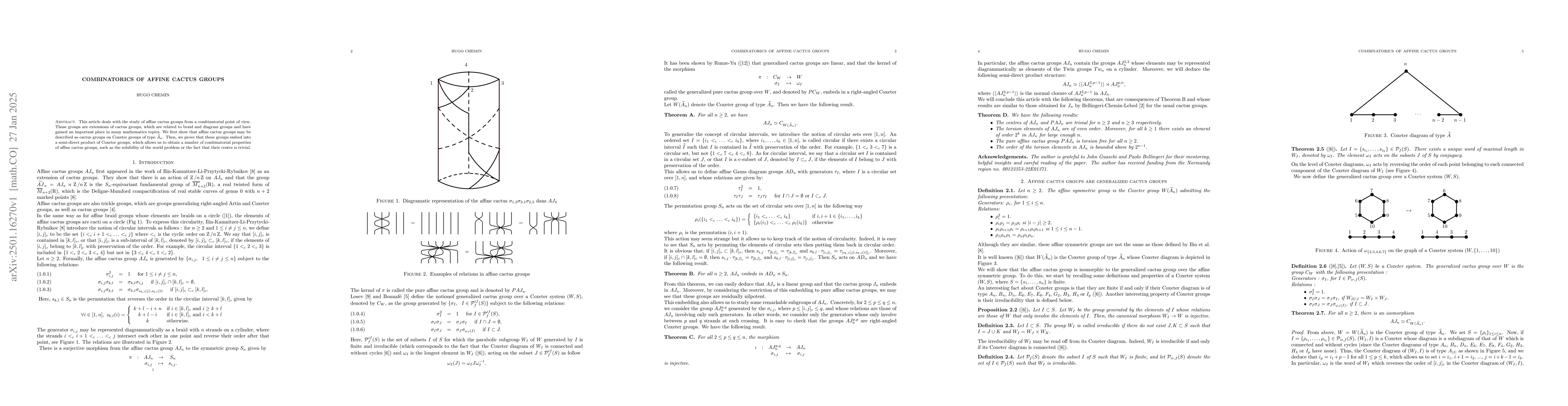 This paper explores affine cactus groups through combinatorial analysis, demonstrating their equivalence to cactus groups on Coxeter groups of type eAn, and proves their embedding into a semi-direct product of Coxeter groups, revealing properties like solubility of the word problem and a trivial centre.
