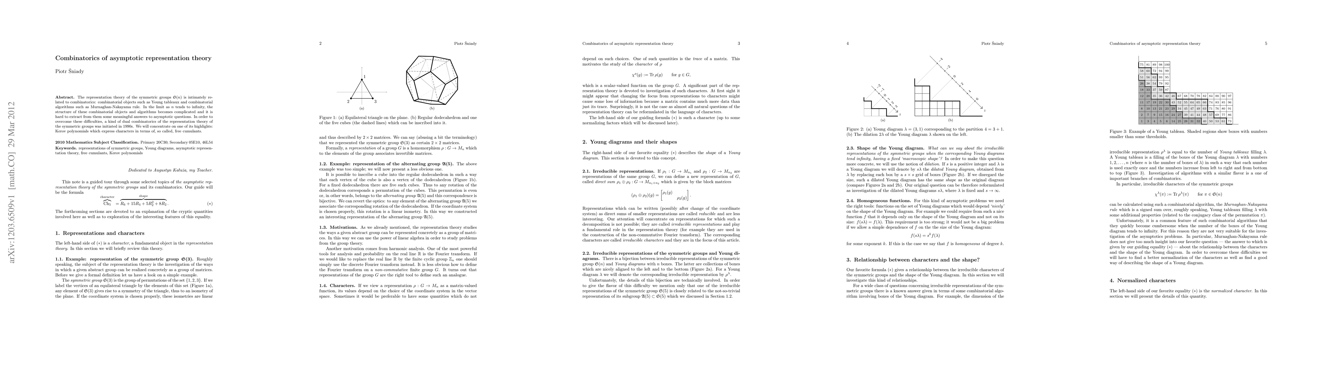 This paper explores the asymptotic representation theory of symmetric groups, focusing on Kerov polynomials that relate characters to free cumulants, providing a dual combinatorial framework to address complexities arising in large-dimensional settings.