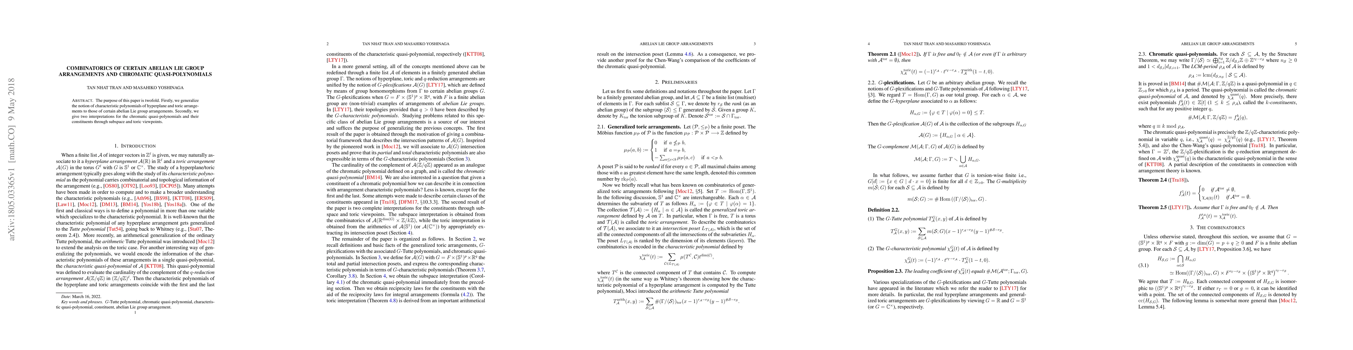 This paper generalizes characteristic polynomials of arrangements to abelian Lie group arrangements and provides two interpretations of chromatic quasi-polynomials from subspace and toric perspectives.
