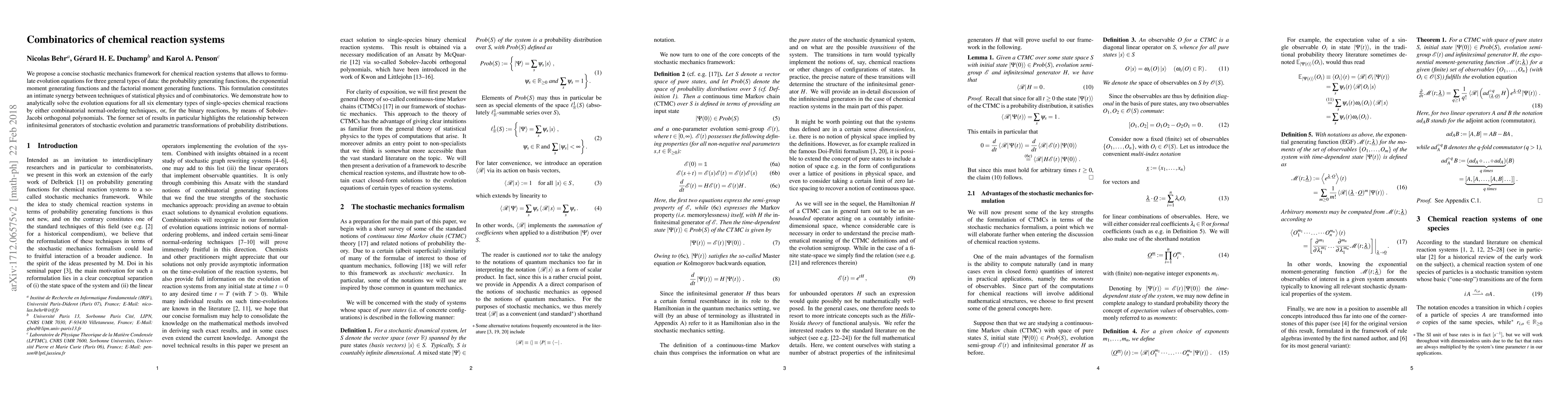 We propose a concise stochastic mechanics framework for chemical reaction systems that allows to formulate evolution equations for three general types of data: the probability generating functions, the exponential moment generating functions and the factorial moment generating functions. This formulation constitutes an intimate synergy between techniques of statistical physics and of combinatorics. We demonstrate how to analytically solve the evolution equations for all six elementary types of single-species chemical reactions by either combinatorial normal-ordering techniques, or, for the binary reactions, by means of Sobolev-Jacobi orthogonal polynomials. The former set of results in particular highlights the relationship between infinitesimal generators of stochastic evolution and parametric transformations of probability distributions.