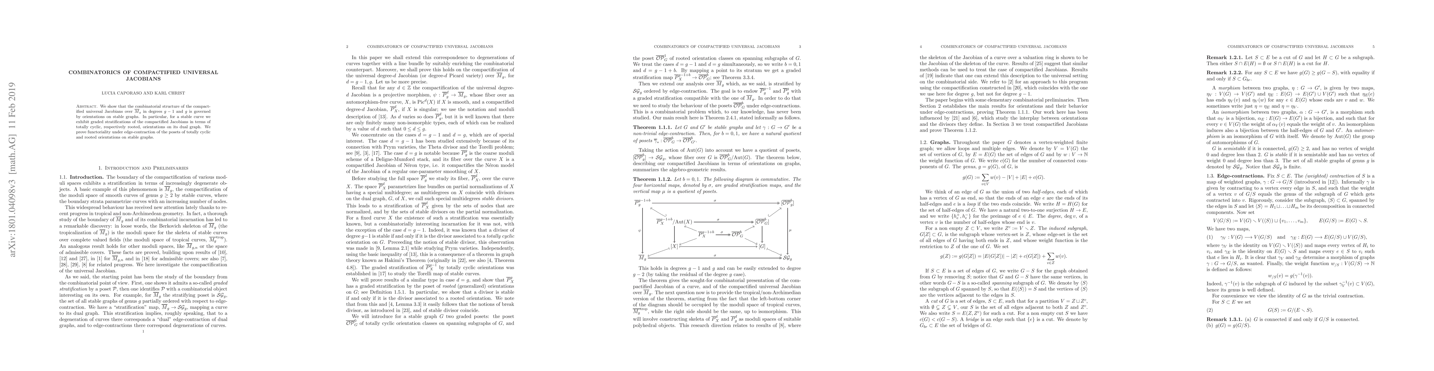The paper explores the combinatorial structure of compactified universal Jacobians in degrees g-1 and g over the moduli space of stable curves, using orientations on stable graphs and presenting graded stratifications compatible with \Mgb. The compactified Jacobians are stratified based on totally cyclic and rooted orientations on subgraphs of the dual graph of a stable curve.