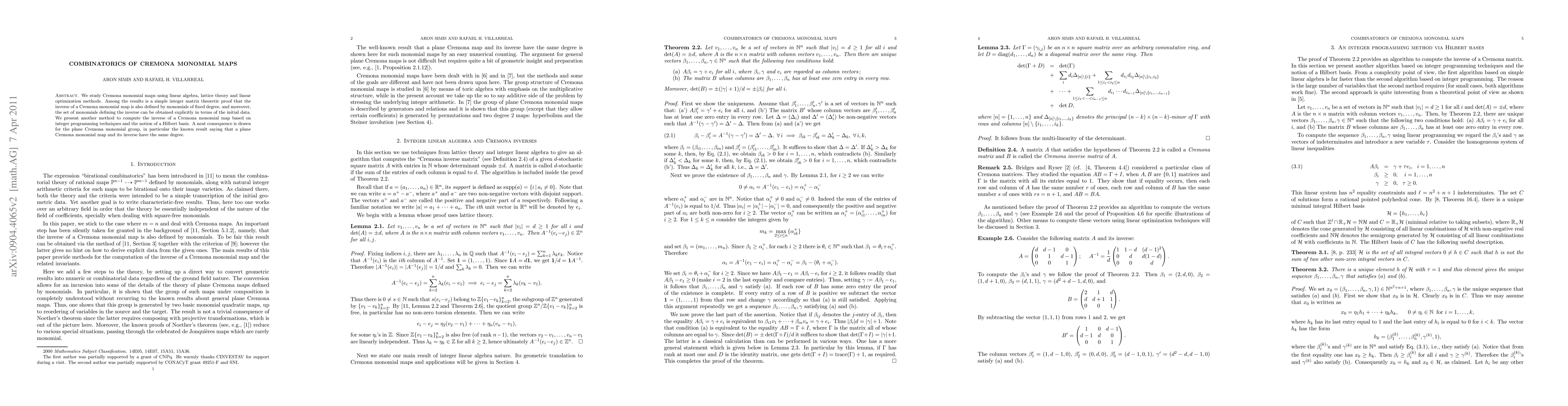 This paper presents a combinatorial proof that the inverse of a Cremona monomial map is also a monomial map of fixed degree, with explicit construction of the inverse monomials. It also discusses computational aspects of these combinatorial invariants for the plane Cremona monomial group.