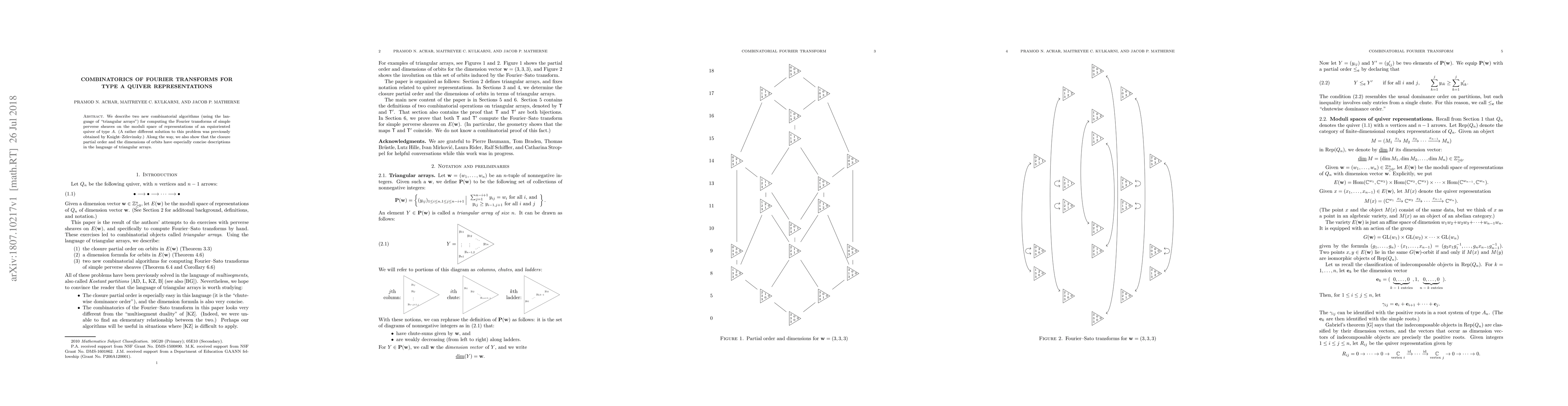 This paper introduces two new combinatorial algorithms for calculating Fourier transforms of simple perverse sheaves on moduli spaces of type A quiver representations, expressed through "triangular arrays." It also reveals succinct representations of the closure partial order and orbit dimensions using this approach.