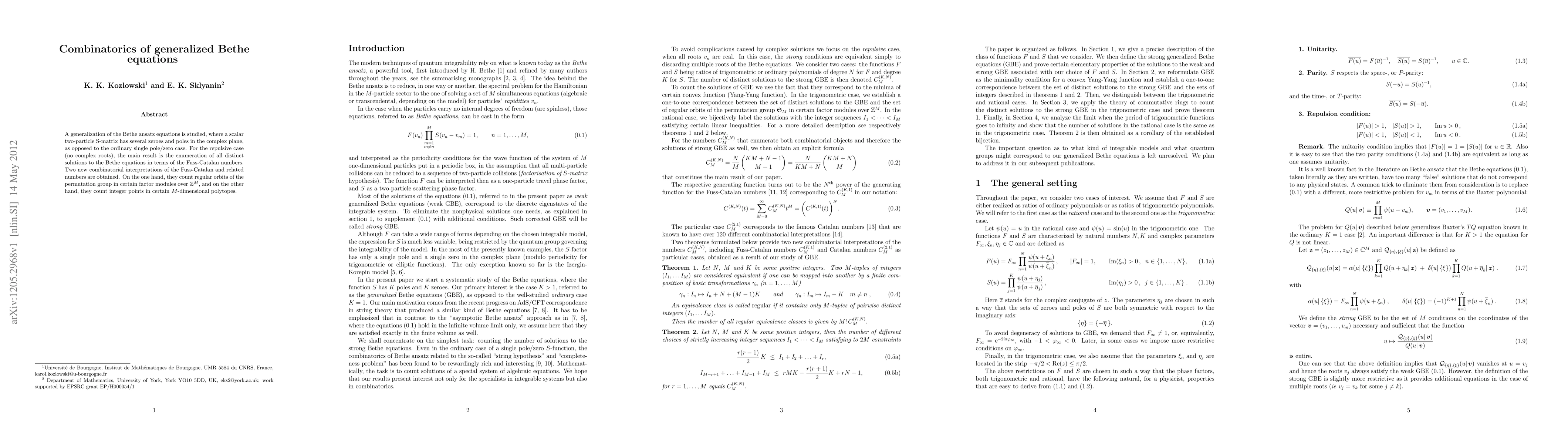 A generalization of the Bethe ansatz equations is studied, where a scalar two-particle S-matrix has several zeroes and poles in the complex plane, as opposed to the ordinary single pole/zero case. For the repulsive case (no complex roots), the main result is the enumeration of all distinct solutions to the Bethe equations in terms of the Fuss-Catalan numbers. Two new combinatorial interpretations of the Fuss-Catalan and related numbers are obtained. On the one hand, they count regular orbits of the permutation group in certain factor modules over Z^M, and on the other hand, they count integer points in certain M-dimensional polytopes.