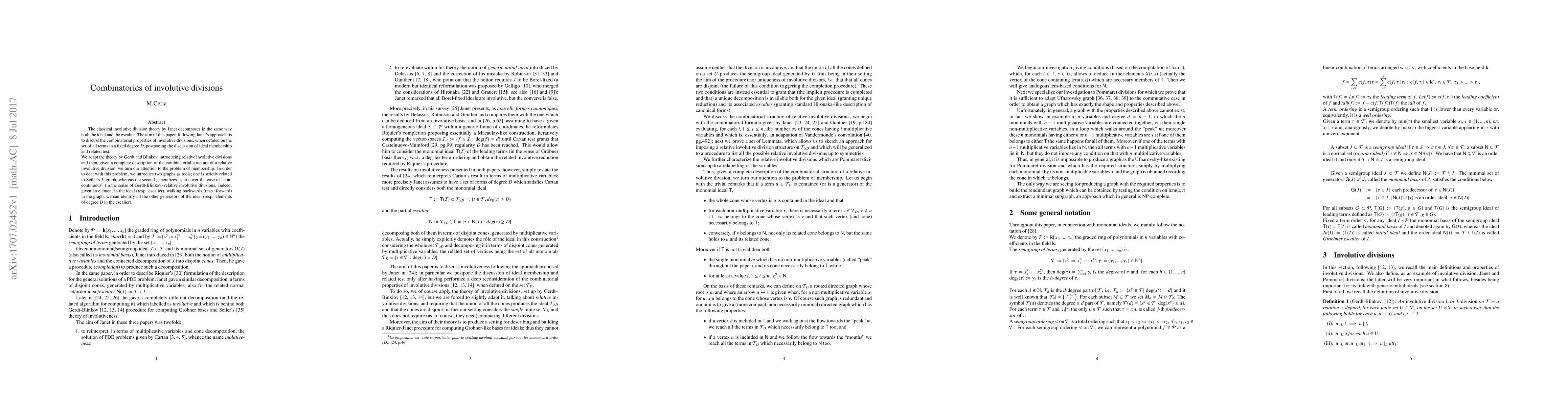 The classical involutive division theory by Janet decomposes in the same way both the ideal and the escalier. The aim of this paper, following Janet's approach, is to discuss the combinatorial properties of involutive divisions, when defined on the set of all terms in a fixed degree D, postponing the discussion of ideal membership and related test. We adapt the theory by Gerdt and Blinkov, introducing relative involutive divisions and then, given a complete description of the combinatorial structure of a relative involutive division, we turn our attention to the problem of membership. In order to deal with this problem, we introduce two graphs as tools, one is strictly related to Seiler's L-graph, whereas the second generalizes it, to cover the case of "non-continuous" (in the sense of Gerdt-Blinkov) relative involutive divisions. Indeed, given an element in the ideal (resp. escalier), walking backwards (resp. forward) in the graph, we can identify all the other generators of the ideal (resp. elements of degree D in the escalier).