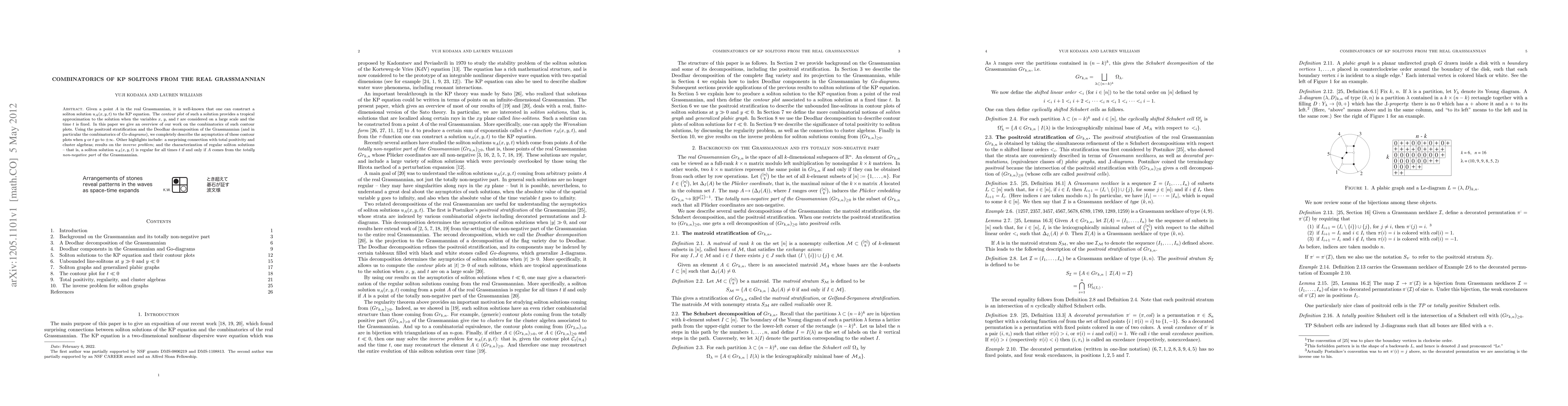 This paper explores the combinatorics of soliton solutions to the KP equation derived from points in the real Grassmannian, revealing connections to positroid stratification and Go-diagrams. It characterizes the asymptotic behavior of these solutions and establishes a link between total positivity and cluster algebras.