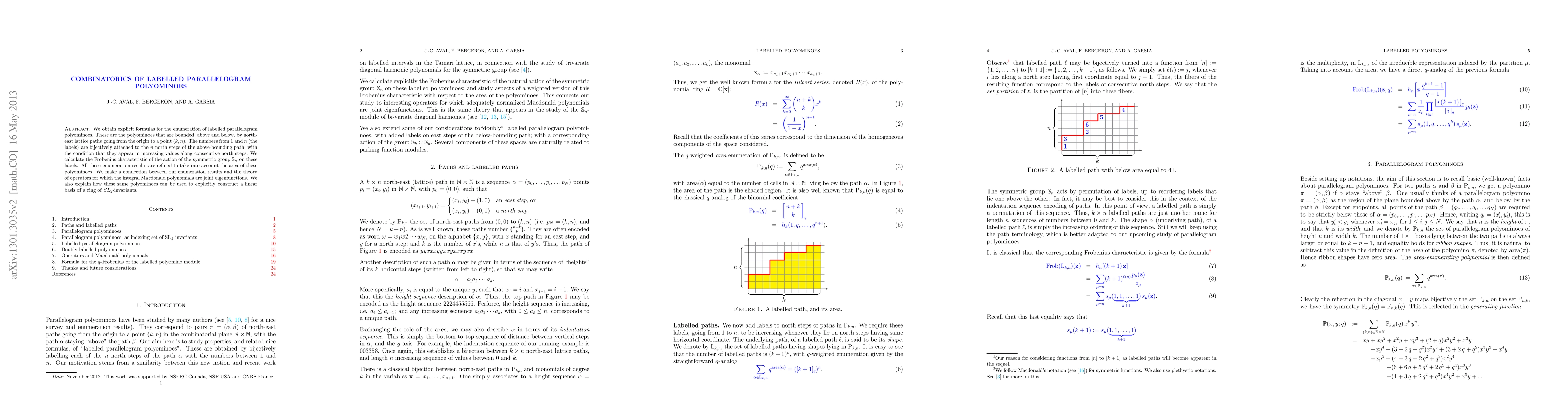 We obtain explicit formulas for the enumeration of labelled parallelogram polyominoes. These are the polyominoes that are bounded, above and below, by north-east lattice paths going from the origin to a point (k,n). The numbers from 1 and n (the labels) are bijectively attached to the $n$ north steps of the above-bounding path, with the condition that they appear in increasing values along consecutive north steps. We calculate the Frobenius characteristic of the action of the symmetric group S_n on these labels. All these enumeration results are refined to take into account the area of these polyominoes. We make a connection between our enumeration results and the theory of operators for which the intergral Macdonald polynomials are joint eigenfunctions. We also explain how these same polyominoes can be used to explicitly construct a linear basis of a ring of SL_2-invariants.