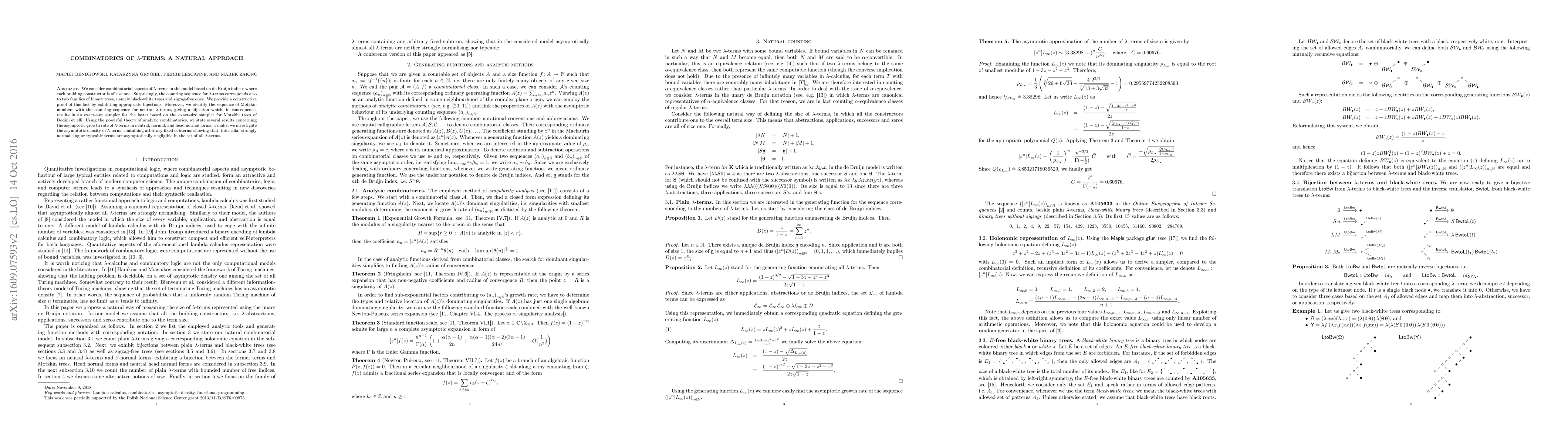 We consider combinatorial aspects of $\lambda$-terms in the model based on de Bruijn indices where each building constructor is of size one. Surprisingly, the counting sequence for $\lambda$-terms corresponds also to two families of binary trees, namely black-white trees and zigzag-free ones. We provide a constructive proof of this fact by exhibiting appropriate bijections. Moreover, we identify the sequence of Motzkin numbers with the counting sequence for neutral $\lambda$-terms, giving a bijection which, in consequence, results in an exact-size sampler for the latter based on the exact-size sampler for Motzkin trees of Bodini et alli. Using the powerful theory of analytic combinatorics, we state several results concerning the asymptotic growth rate of $\lambda$-terms in neutral, normal, and head normal forms. Finally, we investigate the asymptotic density of $\lambda$-terms containing arbitrary fixed subterms showing that, inter alia, strongly normalising or typeable terms are asymptotically negligible in the set of all $\lambda$-terms.