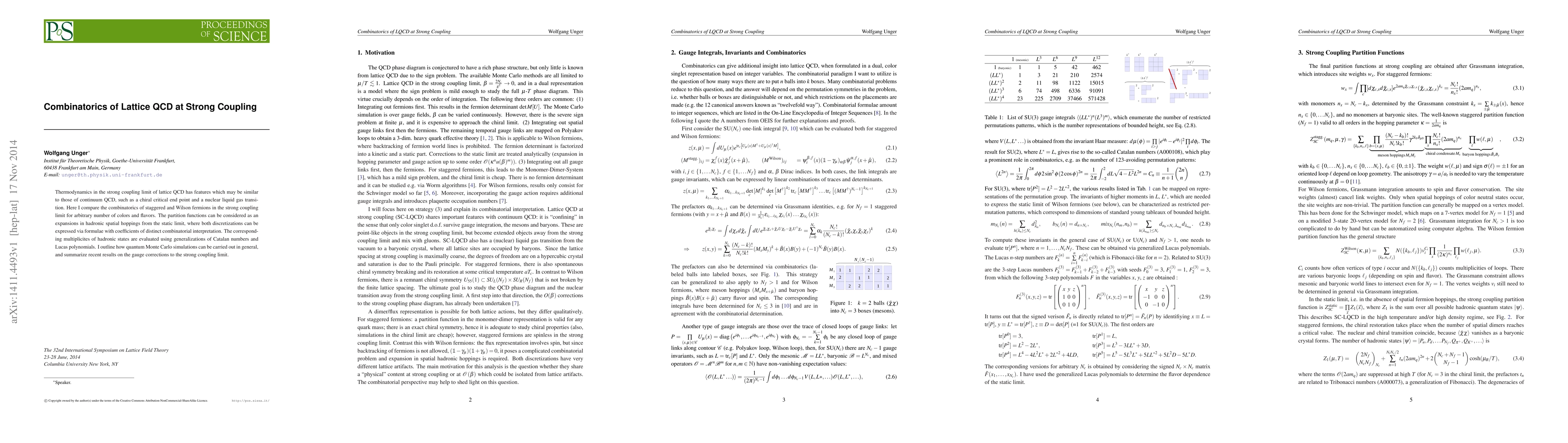 This paper explores the combinatorial aspects of lattice QCD at strong coupling, comparing staggered and Wilson fermions for various colors and flavors. It employs generalizations of Catalan numbers and Lucas polynomials to evaluate hadronic state multiplicities, and discusses the application of quantum Monte Carlo simulations in this context.