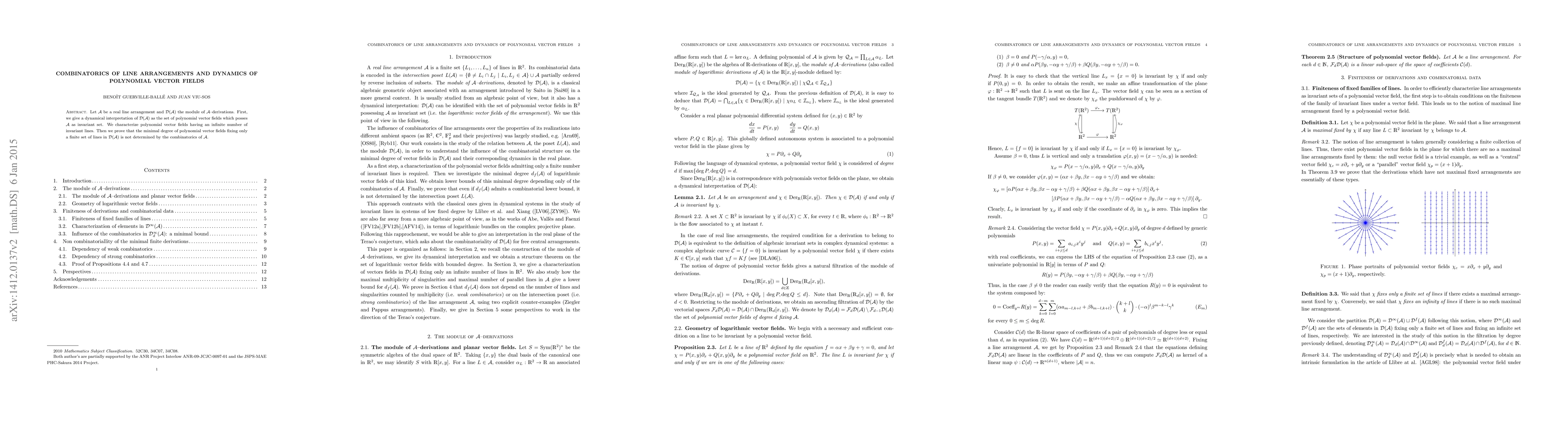Let $\mathcal{A}$ be a real line arrangement and $\mathcal{D}(\mathcal{A})$ the module of $\mathcal{A}$--derivations. First, we give a dynamical interpretation of $\mathcal{D}(\mathcal{A})$ as the set of polynomial vector fields which posses $\mathcal{A}$ as invariant set. We characterize polynomial vector fields having an infinite number of invariant lines. Then we prove that the minimal degree of polynomial vector fields fixing only a finite set of lines in $\mathcal{D}(\mathcal{A})$ is not determined by the combinatorics of $\mathcal{A}$.