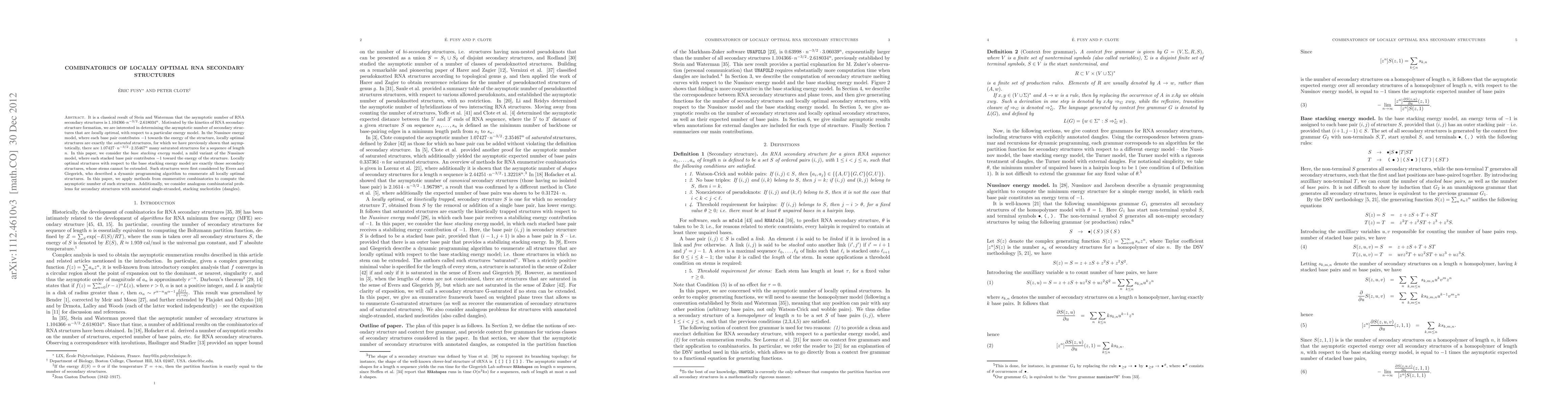 It is a classical result of Stein and Waterman that the asymptotic number of RNA secondary structures is $1.104366 \cdot n^{-3/2} \cdot 2.618034^n$. Motivated by the kinetics of RNA secondary structure formation, we are interested in determining the asymptotic number of secondary structures that are locally optimal, with respect to a particular energy model. In the Nussinov energy model, where each base pair contributes -1 towards the energy of the structure, locally optimal structures are exactly the saturated structures, for which we have previously shown that asymptotically, there are $1.07427\cdot n^{-3/2} \cdot 2.35467^n$ many saturated structures for a sequence of length $n$. In this paper, we consider the base stacking energy model, a mild variant of the Nussinov model, where each stacked base pair contributes -1 toward the energy of the structure. Locally optimal structures with respect to the base stacking energy model are exactly those secondary structures, whose stems cannot be extended. Such structures were first considered by Evers and Giegerich, who described a dynamic programming algorithm to enumerate all locally optimal structures. In this paper, we apply methods from enumerative combinatorics to compute the asymptotic number of such structures. Additionally, we consider analogous combinatorial problems for secondary structures with annotated single-stranded, stacking nucleotides (dangles).
