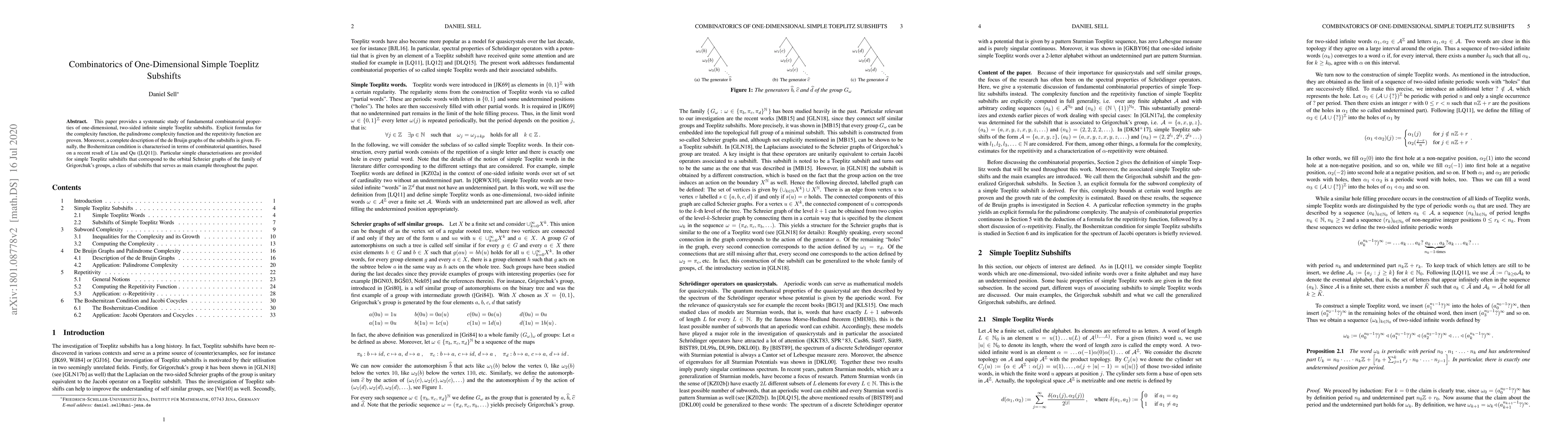 This paper investigates the combinatorial properties of one-dimensional simple Toeplitz subshifts, deriving explicit formulas for complexity, palindrome complexity, and repetitivity functions, describing their de Bruijn graphs, and characterizing the Boshernitzan condition via combinatorial quantities, with special focus on Grigorchuk's groups as an illustrative example.