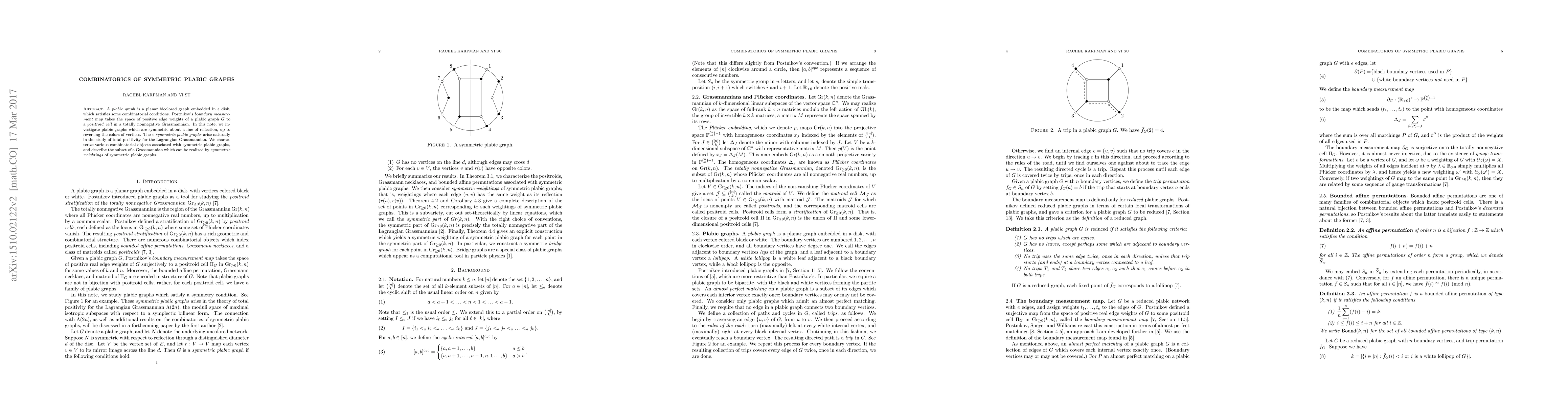 A plabic graph is a planar bicolored graph embedded in a disk, which satisfies some combinatorial conditions. Postnikov's boundary measurement map takes the space of positive edge weights of a plabic graph $G$ to a positroid cell in some totally nonnegative Grassmannian. In this note, we investigate plabic graphs which are symmetric about a line of reflection, up to reversing the colors of vertices. These symmetric plabic graphs arise naturally in the study of total positivity for the Lagrangian Grassmannian. We characterize various combinatorial objects associated with symmetric plabic graphs, and describe the subset of a Grassmannian which can be realized by symmetric weightings of symmetric plabic graphs.