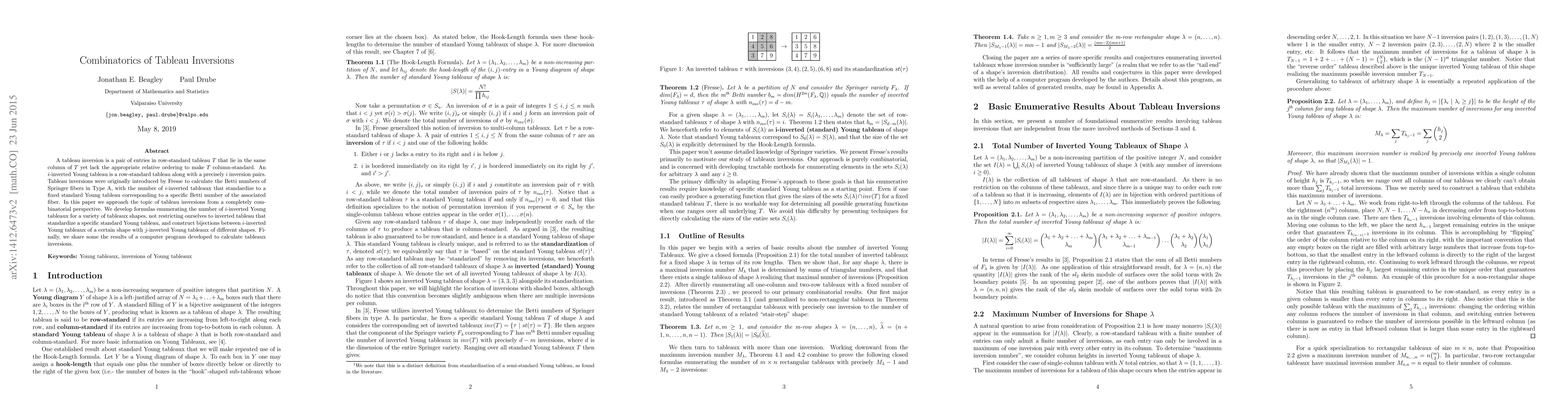 A tableau inversion is a pair of entries in row-standard tableau $T$ that lie in the same column of $T$ yet lack the appropriate relative ordering to make $T$ column-standard. An $i$-inverted Young tableau is a row-standard tableau along with a precisely $i$ inversion pairs. Tableau inversions were originally introduced by Fresse to calculate the Betti numbers of Springer fibers in Type A, with the number of $i$-inverted tableaux that standardize to a fixed standard Young tableau corresponding to a specific Betti number of the associated fiber. In this paper we approach the topic of tableau inversions from a completely combinatorial perspective. We develop formulas enumerating the number of $i$-inverted Young tableaux for a variety of tableaux shapes, not restricting ourselves to inverted tableaux that standardize a specific standard Young tableau, and construct bijections between $i$-inverted Young tableaux of a certain shape with $j$-inverted Young tableaux of different shapes. Finally, we share some the results of a computer program developed to calculate tableaux inversions.