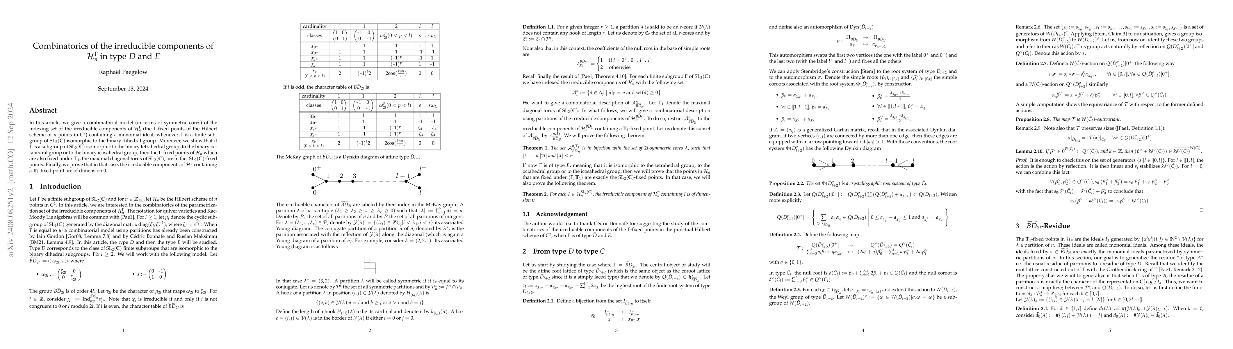 This paper develops a combinatorial model for the irreducible components of $\mathcal{H}_n^{\Gamma}$ in type $D$ and $E$, based on symmetric cores. It shows that $\Gamma$-fixed points on $\mathcal{H}_n$ are $\mathrm{SL}_2(\mathbb{C})$-fixed points when $\Gamma$ is a binary polyhedral group, and that these components have dimension $0$.