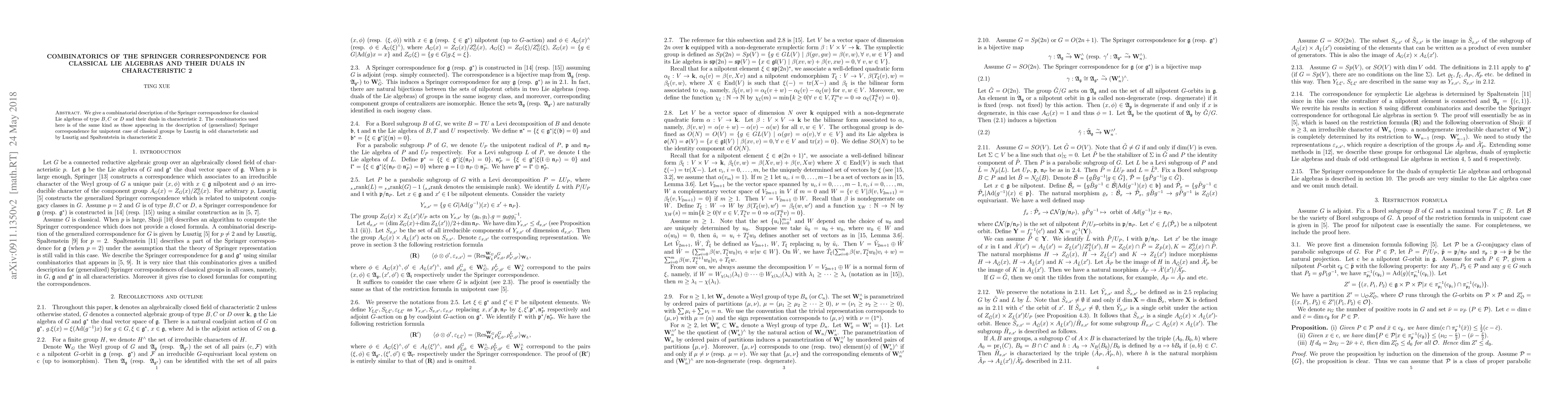 This paper presents a combinatorial framework for the Springer correspondence in classical Lie algebras $\mathfrak{g}$ of types $B, C, D$ and their duals $\mathfrak{g}^*$ in characteristic 2. The combinatorics mirrors that used in previous studies of the unipotent case in classical groups, providing a unified description across all characteristics.