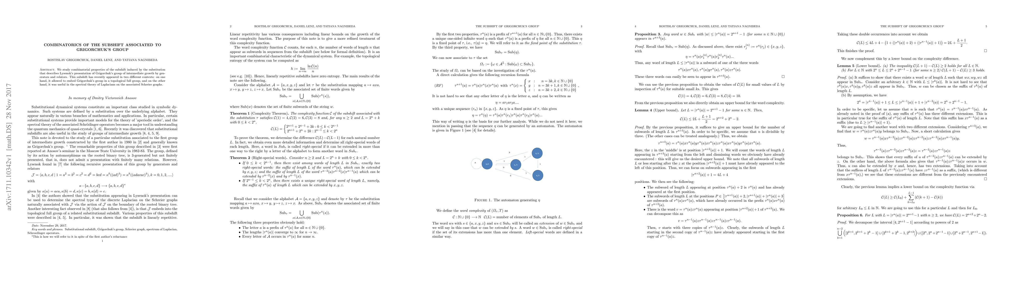 This paper investigates the combinatorial properties of a subshift linked to Lysenok's presentation of Grigorchuk's group, revealing its significance in embedding the group in a topological full group and in spectral theory of Laplacians on Schreier graphs.