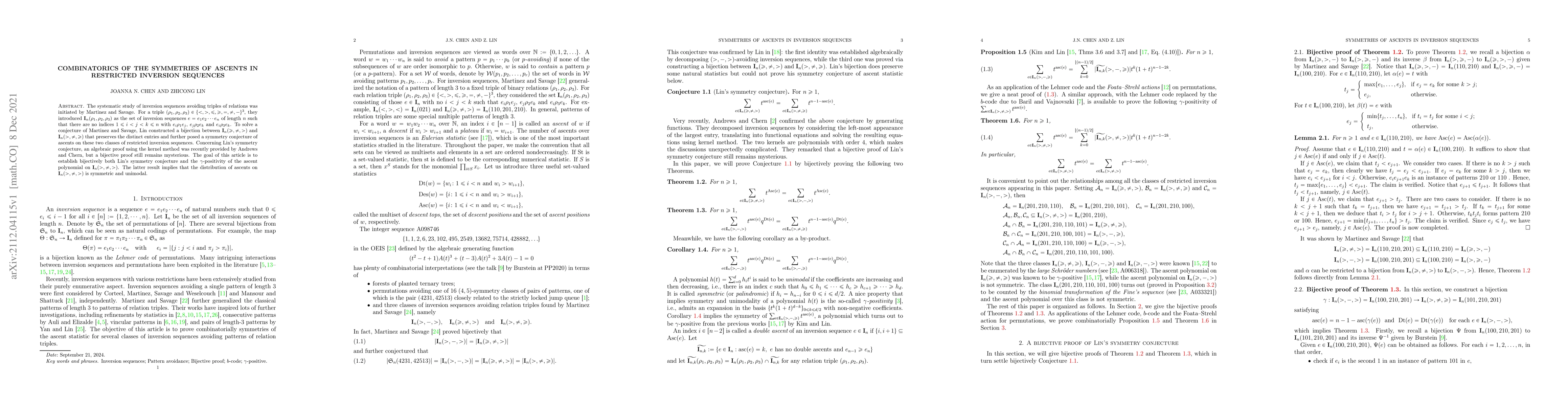 The work extends previous research by Martinez and Savage by providing a bijective proof for Lin's symmetry conjecture and linking it to the $\gamma$-positivity of ascent polynomials, offering new insights into the structure and properties of restricted inversion sequences.