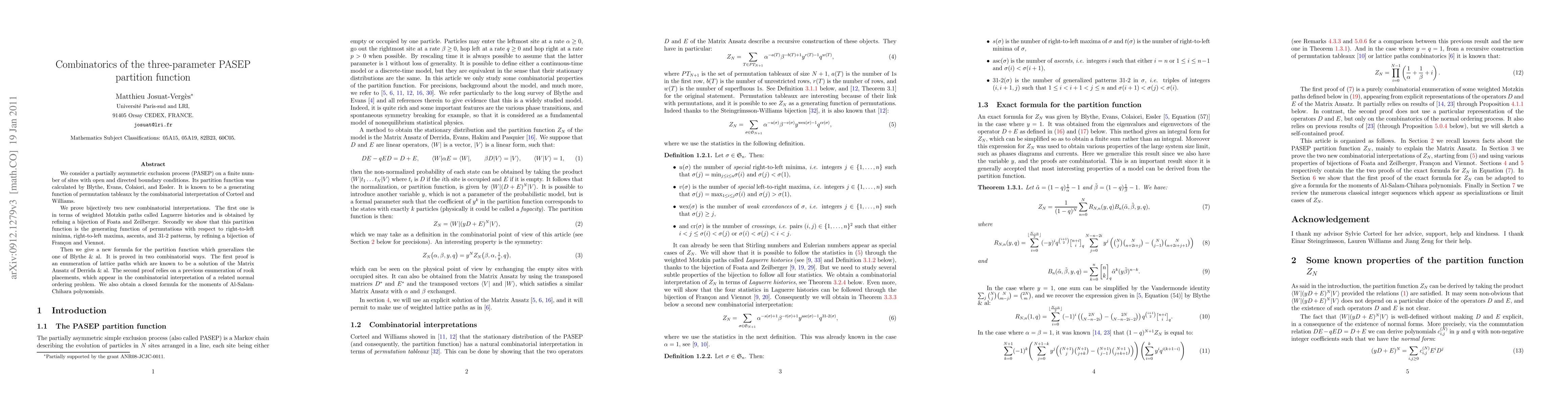 The paper proves two new combinatorial interpretations of the three-parameter PASEP partition function, establishes a new formula for it, and provides closed formulas for related moments, advancing understanding in the field of partially asymmetric exclusion processes.