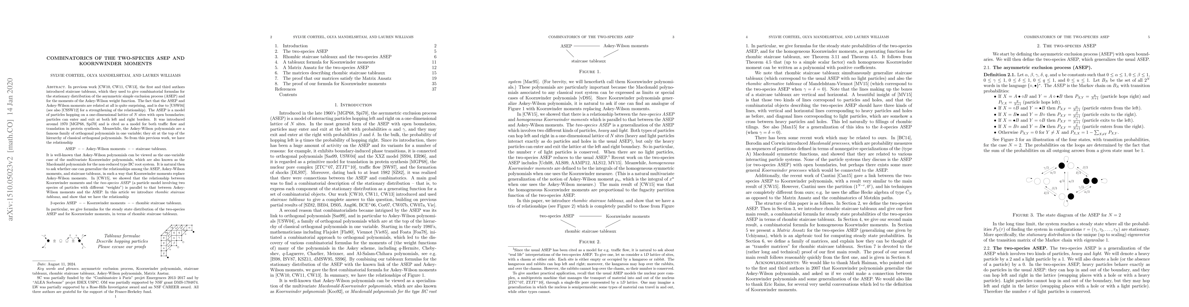 In previous work, the first and third authors introduced staircase tableaux, which they used to give combinatorial formulas for the stationary distribution of the asymmetric simple exclusion process (ASEP) and for the moments of the Askey-Wilson weight function. The fact that the ASEP and Askey-Wilson moments are related at all is quite surprising, and is due to Uchiyama-Sasamoto-Wadati. The ASEP is a model of particles hopping on a one-dimensional lattice of N sites with open boundaries, particles can enter and exit at both left and right borders. It was introduced around 1970 and is cited as a model for both traffic flow and translation in protein synthesis. Meanwhile, the Askey-Wilson polynomials are a family of orthogonal polynomials in one variable, they sit at the top of the hierarchy of classical orthogonal polynomials. So we have the relationship ASEP -- staircase tableaux -- Askey-Wilson moments It is well-known that Askey-Wilson polynomials can be viewed as the one-variable case of the multivariate Koornwinder polynomials, also known as the Macdonald polynomials for the type BC root system. It is natural then to ask whether one can generalize the relationships among the ASEP, Askey-Wilson moments, and staircase tableaux, in such a way that Koornwinder moments replace Askey-Wilson moments. In a recent work, we demonstrated a close connection between Koornwinder moments and the two-species ASEP (a particle model involving two species of particles with different "weights"). In this article we introduce rhombic staircase tableaux, and show that we have the relationship 2-species ASEP -- rhombic staircase tableaux -- Koornwinder moments In particular, we give formulas for the steady state distribution of the two-species ASEP and for Koornwinder moments, in terms of rhombic staircase tableaux.