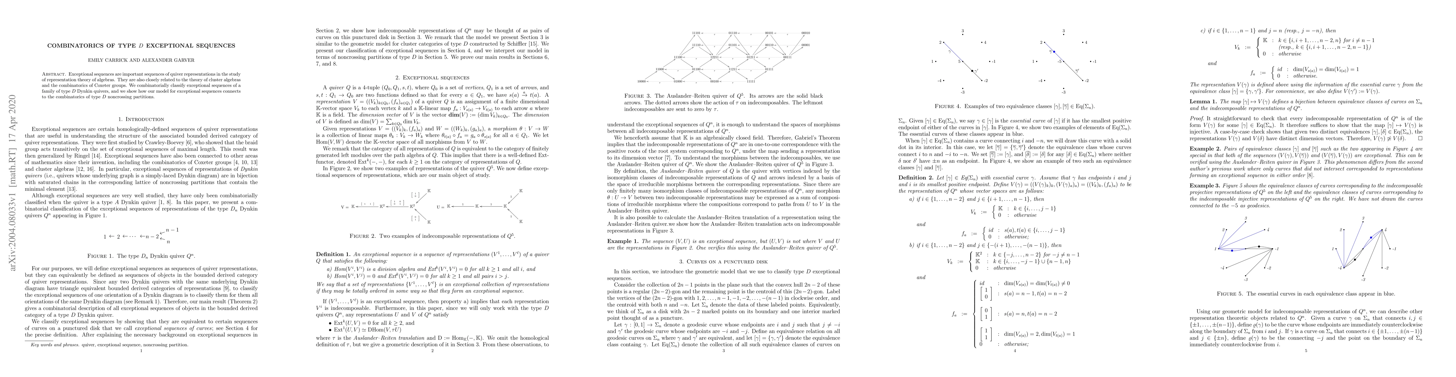 This paper combinatorially classifies exceptional sequences in type D Dynkin quivers and demonstrates their connection to the combinatorics of type D noncrossing partitions, linking representation theory to cluster algebras and Coxeter groups.