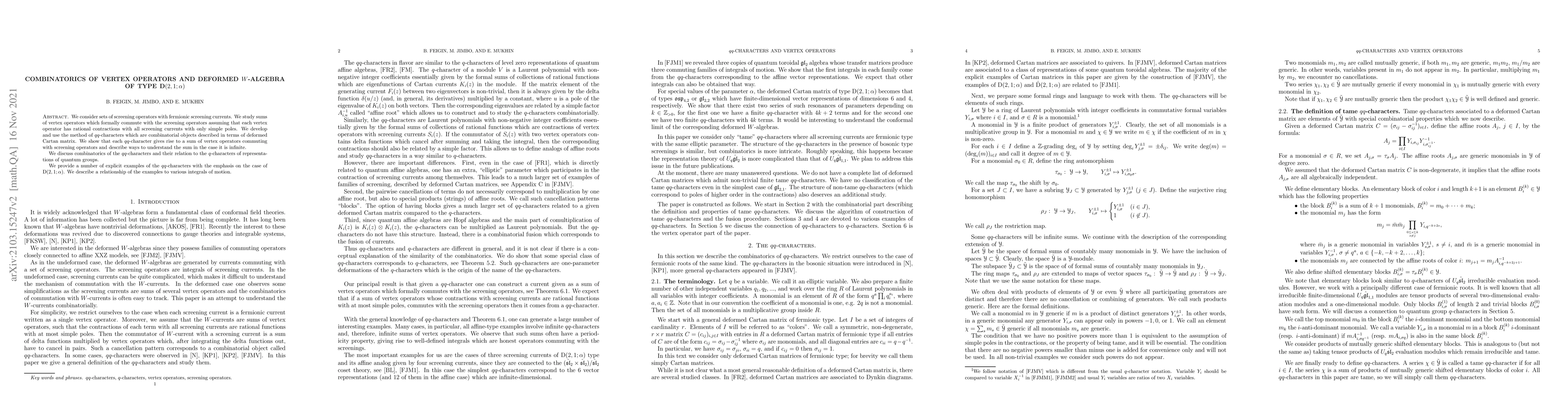 We consider sets of screening operators with fermionic screening currents. We study sums of vertex operators which formally commute with the screening operators assuming that each vertex operator has rational contractions with all screening currents with only simple poles. We develop and use the method of $qq$-characters which are combinatorial objects described in terms of deformed Cartan matrix. We show that each qq-character gives rise to a sum of vertex operators commuting with screening operators and describe ways to understand the sum in the case it is infinite. We discuss combinatorics of the qq-characters and their relation to the q-characters of representations of quantum groups. We provide a number of explicit examples of the qq-characters with the emphasis on the case of $D(2,1;\alpha)$. We describe a relationship of the examples to various integrals of motion.