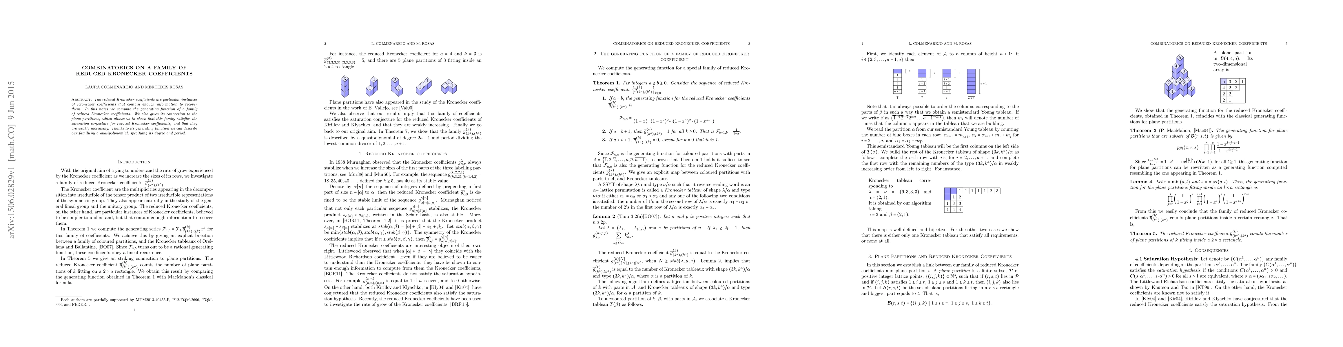 This paper computes the generating function for a family of reduced Kronecker coefficients, linking them to plane partitions and proving they satisfy the saturation conjecture and are weakly increasing. The family is described by a quasipolynomial indicating its degree and period.