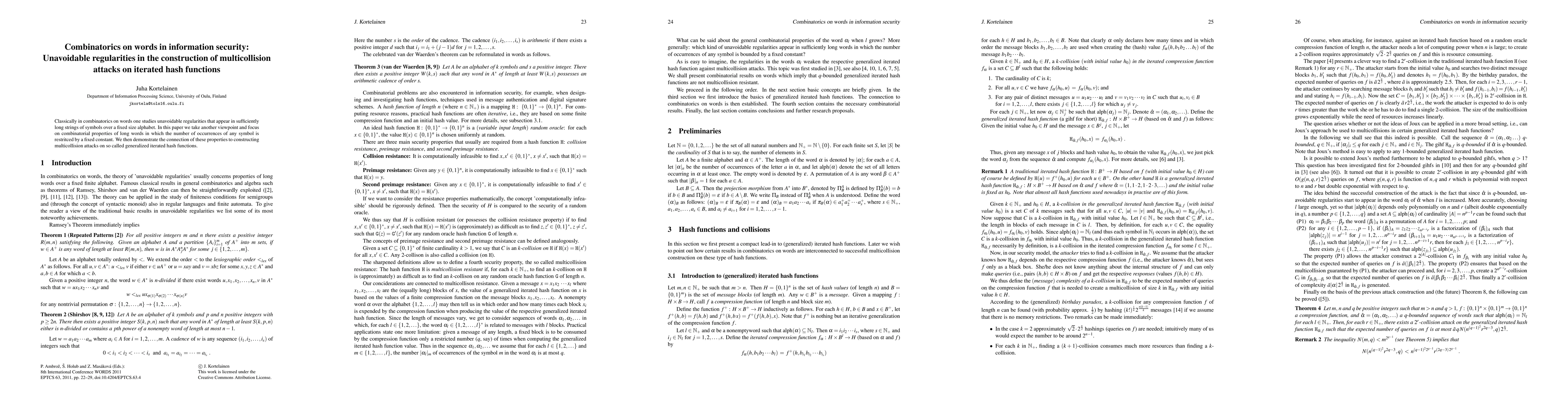 This paper explores combinatorial properties of long strings with restricted symbol occurrences, demonstrating their relevance in constructing multicollision attacks on generalized iterated hash functions, thereby linking combinatorics on words to information security.