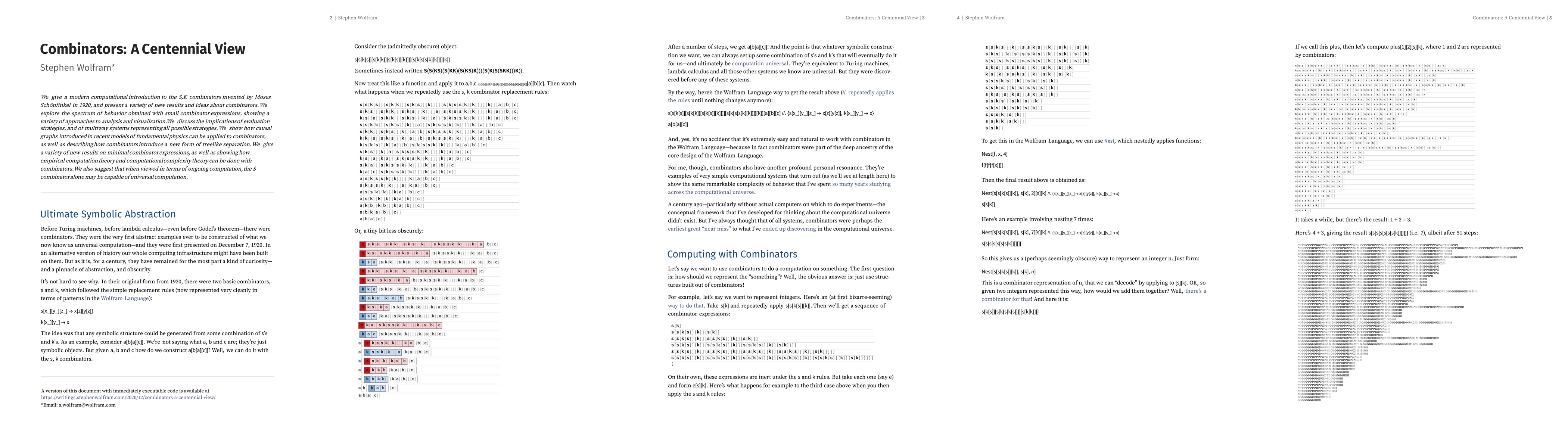 We give a modern computational introduction to the S,K combinators invented by Moses Sch\"onfinkel in 1920, and present a variety of new results and ideas about combinators. We explore the spectrum of behavior obtained with small combinator expressions, showing a variety of approaches to analysis and visualization. We discuss the implications of evaluation strategies, and of multiway systems representing all possible strategies. We show how causal graphs introduced in recent models of fundamental physics can be applied to combinators, as well as describing how combinators introduce a new form of treelike separation. We give a variety of new results on minimal combinator expressions, as well as showing how empirical computation theory and computational complexity theory can be done with combinators. We also suggest that when viewed in terms of ongoing computation, the S combinator alone may be capable of universal computation.