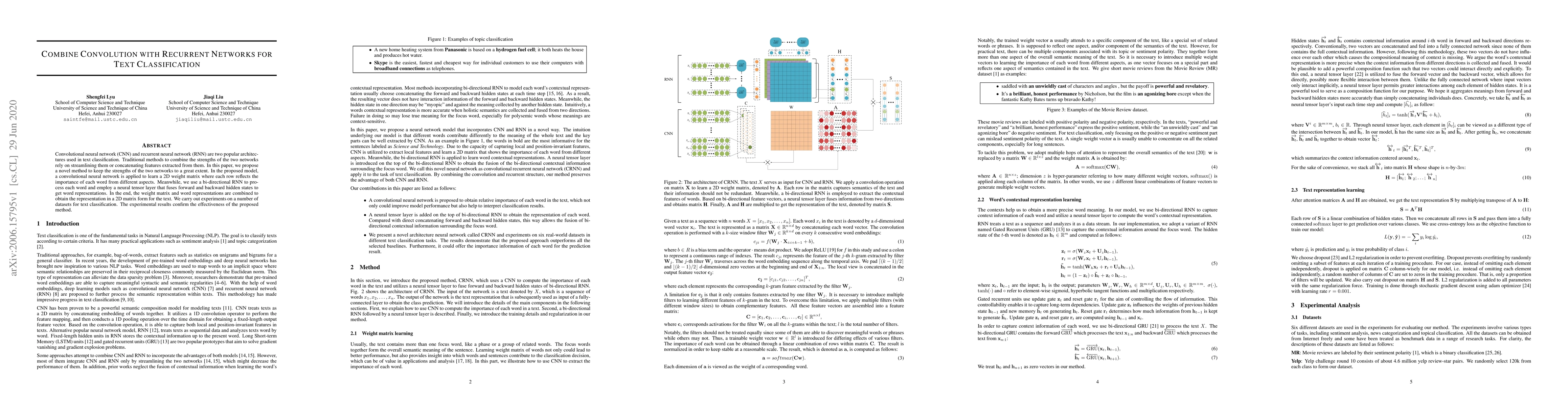 Convolutional neural network (CNN) and recurrent neural network (RNN) are two popular architectures used in text classification. Traditional methods to combine the strengths of the two networks rely on streamlining them or concatenating features extracted from them. In this paper, we propose a novel method to keep the strengths of the two networks to a great extent. In the proposed model, a convolutional neural network is applied to learn a 2D weight matrix where each row reflects the importance of each word from different aspects. Meanwhile, we use a bi-directional RNN to process each word and employ a neural tensor layer that fuses forward and backward hidden states to get word representations. In the end, the weight matrix and word representations are combined to obtain the representation in a 2D matrix form for the text. We carry out experiments on a number of datasets for text classification. The experimental results confirm the effectiveness of the proposed method.