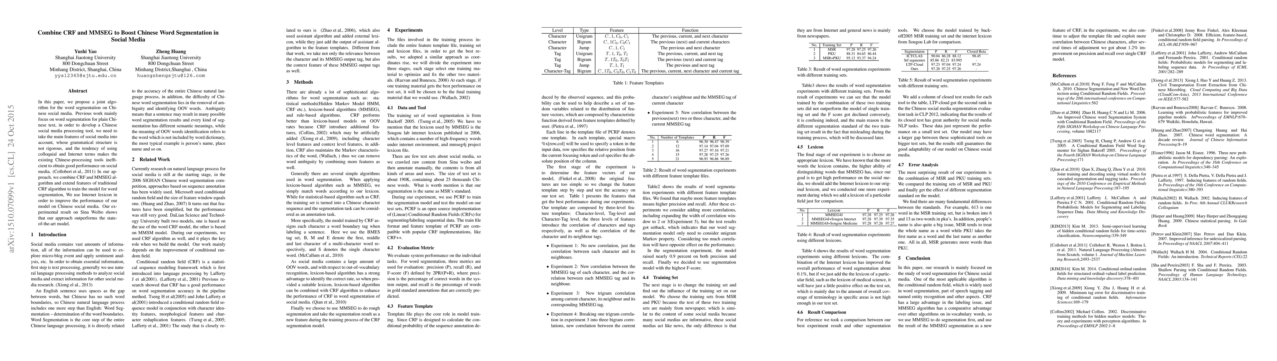 This paper presents a joint algorithm combining CRF and MMSEG to enhance Chinese word segmentation for social media, addressing the inefficiency of existing tools in handling informal and colloquial language. The approach extends traditional CRF features and incorporates an Internet lexicon, achieving superior performance on Sina Weibo compared to state-of-the-art models.