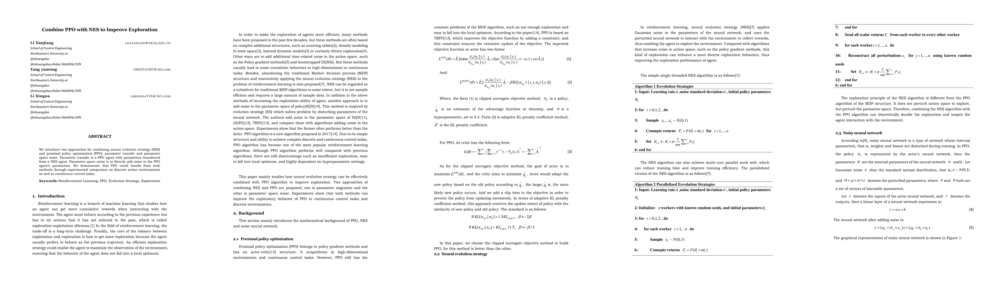 This paper proposes combining neural evolution strategy (NES) with proximal policy optimization (PPO) through two methods: parameter transfer and parameter space noise, showing improved exploration in both discrete and continuous control tasks. Experimental results indicate that both approaches enhance PPO's performance.