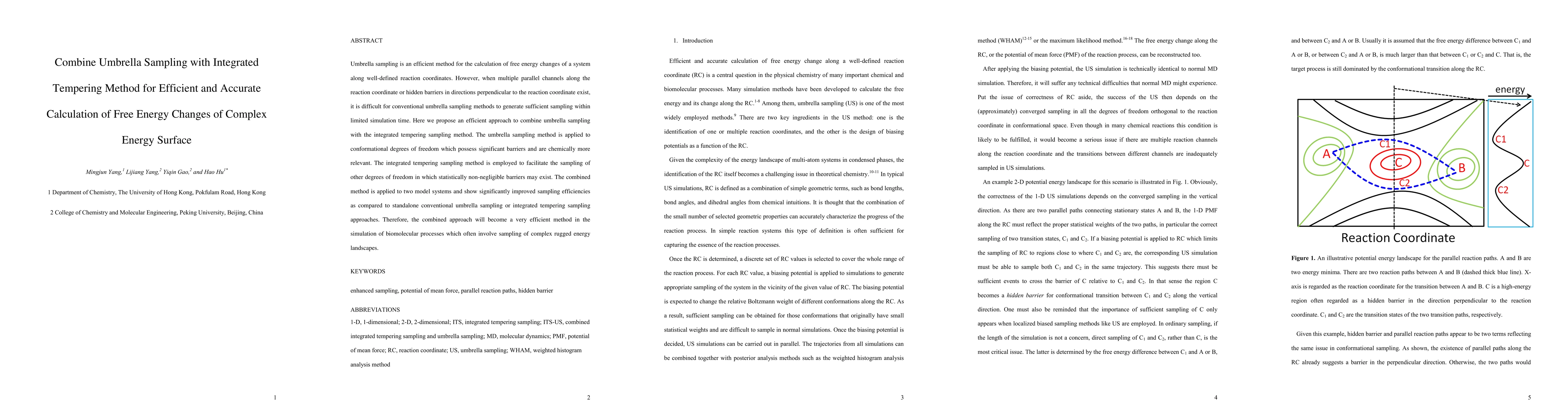 This paper proposes a combined umbrella sampling and integrated tempering method to efficiently calculate free energy changes in complex energy landscapes. It shows improved sampling efficiency over standalone methods, making it effective for simulating biomolecular processes with rugged energy surfaces.