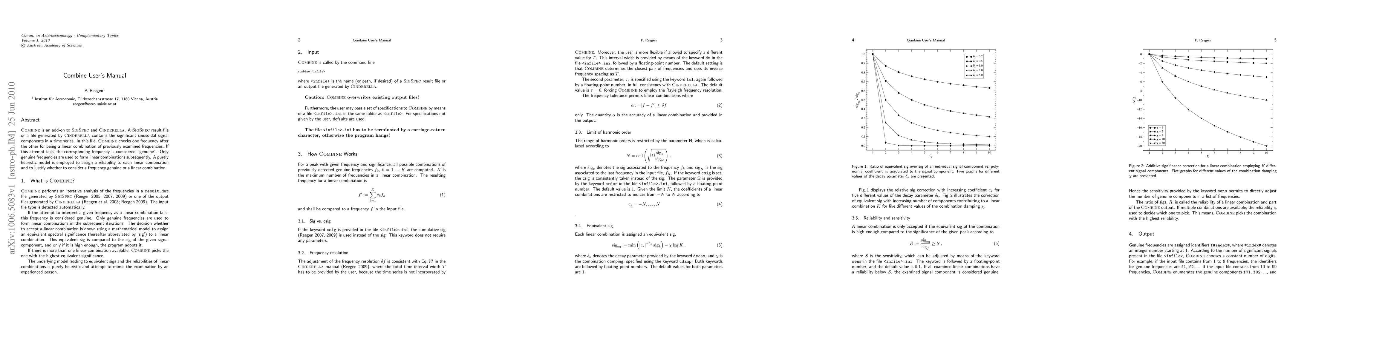 Combine is an add-on tool for SigSpec and Cinderella that identifies genuine sinusoidal frequencies in time series data by checking if new frequencies can be expressed as linear combinations of previously examined frequencies. It assigns reliability to linear combinations and determines the significance of each frequency.