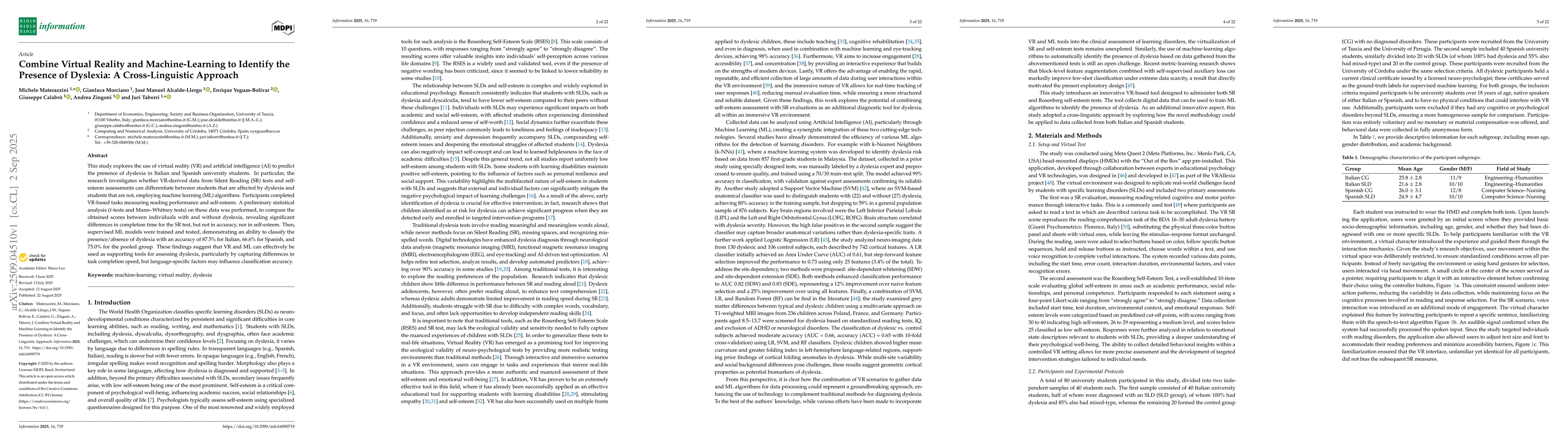 This study explores the use of virtual reality (VR) and artificial intelligence (AI) to predict the presence of dyslexia in Italian and Spanish university students. In particular, the research investigates whether VR-derived data from Silent Reading (SR) tests and self-esteem assessments can differentiate between students that are affected by dyslexia and students that are not, employing machine learning (ML) algorithms. Participants completed VR-based tasks measuring reading performance and self-esteem. A preliminary statistical analysis (t tests and Mann Whitney tests) on these data was performed, to compare the obtained scores between individuals with and without dyslexia, revealing significant differences in completion time for the SR test, but not in accuracy, nor in self esteem. Then, supervised ML models were trained and tested, demonstrating an ability to classify the presence/absence of dyslexia with an accuracy of 87.5 per cent for Italian, 66.6 per cent for Spanish, and 75.0 per cent for the pooled group. These findings suggest that VR and ML can effectively be used as supporting tools for assessing dyslexia, particularly by capturing differences in task completion speed, but language-specific factors may influence classification accuracy.