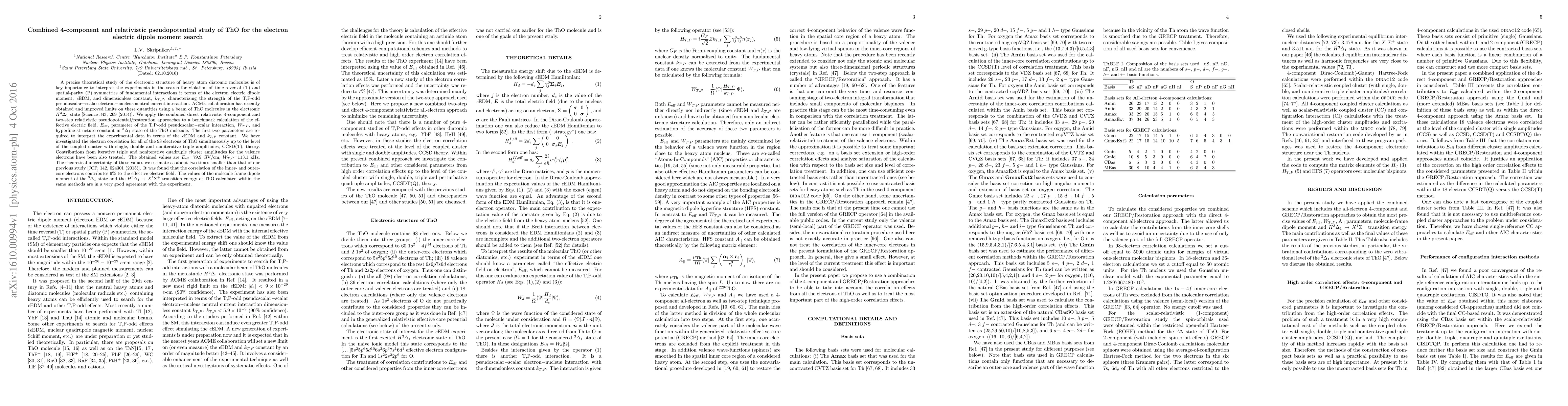 This paper presents a detailed theoretical study of the electronic structure of ThO molecules using combined 4-component and relativistic pseudopotential methods to calculate the effective electric field and the T,P-odd pseudoscalar-scalar interaction parameter, crucial for interpreting experiments searching for electron electric dipole moments. The results show improved accuracy and agreement with experimental data.