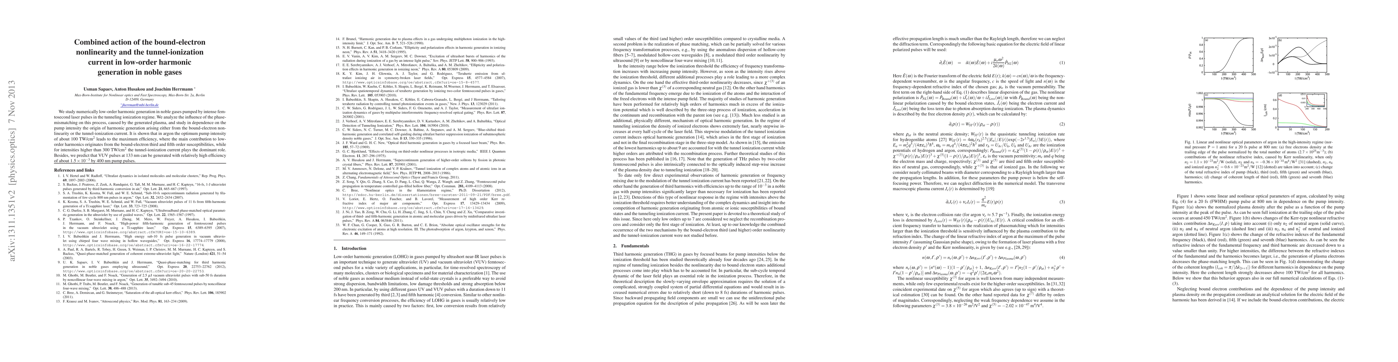 This paper numerically investigates low-order harmonic generation in noble gases using intense femtosecond laser pulses, finding that in argon, harmonics are mainly due to bound-electron nonlinearity at 100 TW/cm$^2$, while higher intensities (over 300 TW/cm$^2$) shift dominance to the tunnel-ionization current. It also predicts high-efficiency VUV pulse generation at 133 nm from 400 nm pump pulses.