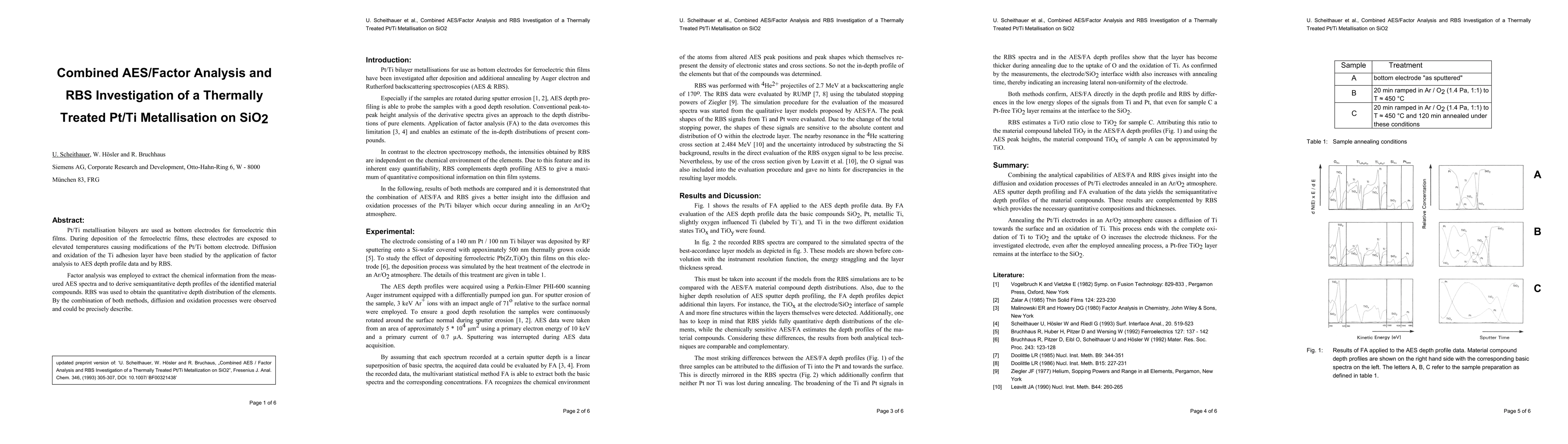 Pt/Ti metallisation bilayers are used as bottom electrodes for ferroelectric thin films. During deposition of the ferroelectric films, these electrodes are exposed to elevated temperatures causing modifications of the Pt/Ti bottom electrode. Diffusion and oxidation of the Ti adhesion layer have been studied by the application of factor analysis to AES depth profile data and by RBS. Factor analysis was employed to extract the chemical information from the measured AES spectra and to derive semiquantitative depth profiles of the identified material compounds. RBS was used to obtain the quantitative depth distribution of the elements. By the combination of both methods, diffusion and oxidation processes were observed and could be precisely describe.
