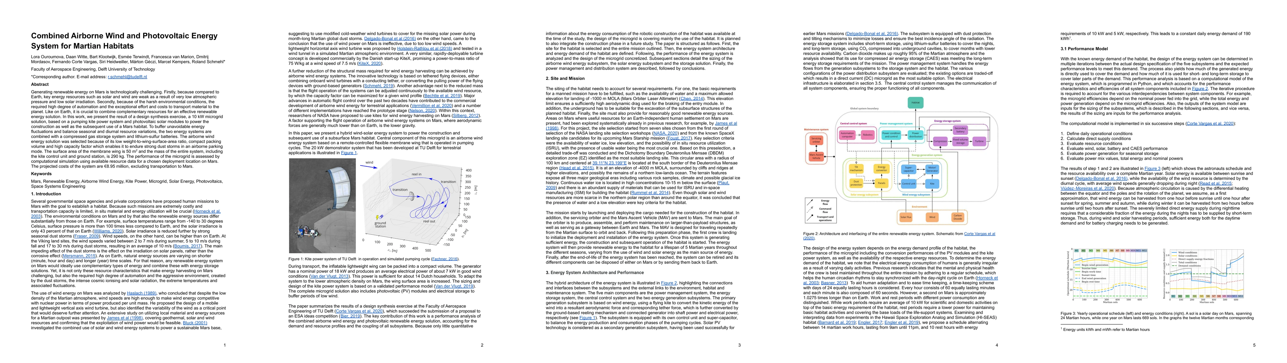 This research proposes a 10 kW microgrid for Martian habitats combining a lightweight airborne wind kite system and photovoltaic solar modules, with energy storage to manage fluctuations. The system aims to address the low energy resources and harsh conditions on Mars, projecting a cost of 8.95 million Euro excluding transport.